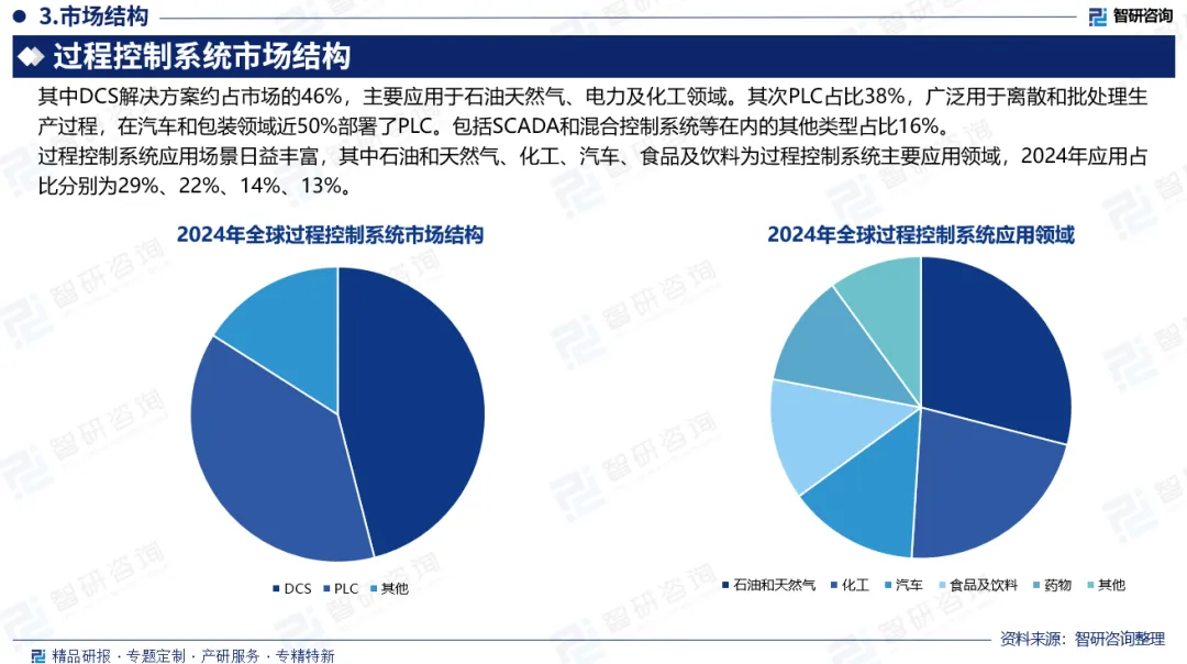 应用分布:过程控制系统应用场景日益丰富,其中石油和天然气、化工、汽车、食品及饮料为过程控制系统主要应用领域,2024年应用占比分别为29%、22%、14%、13%。