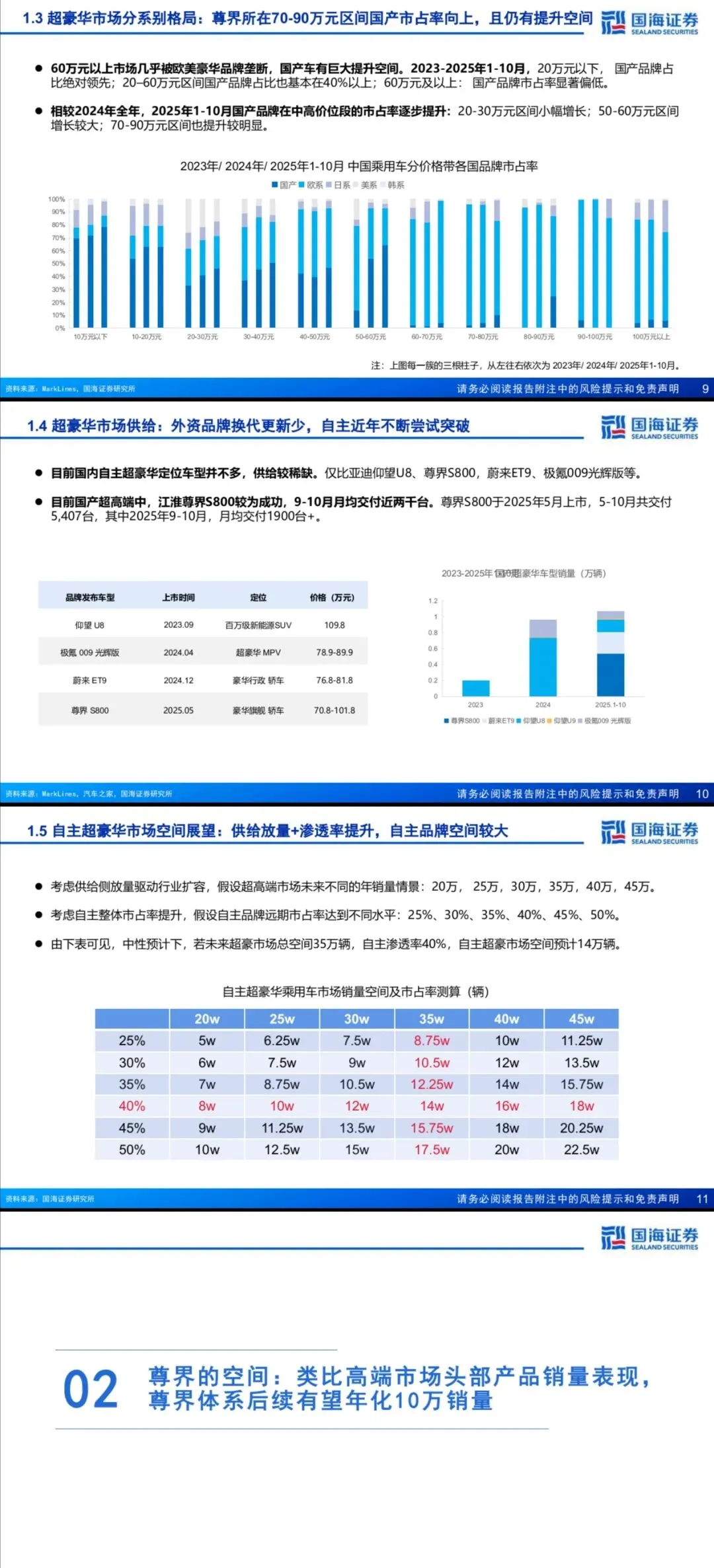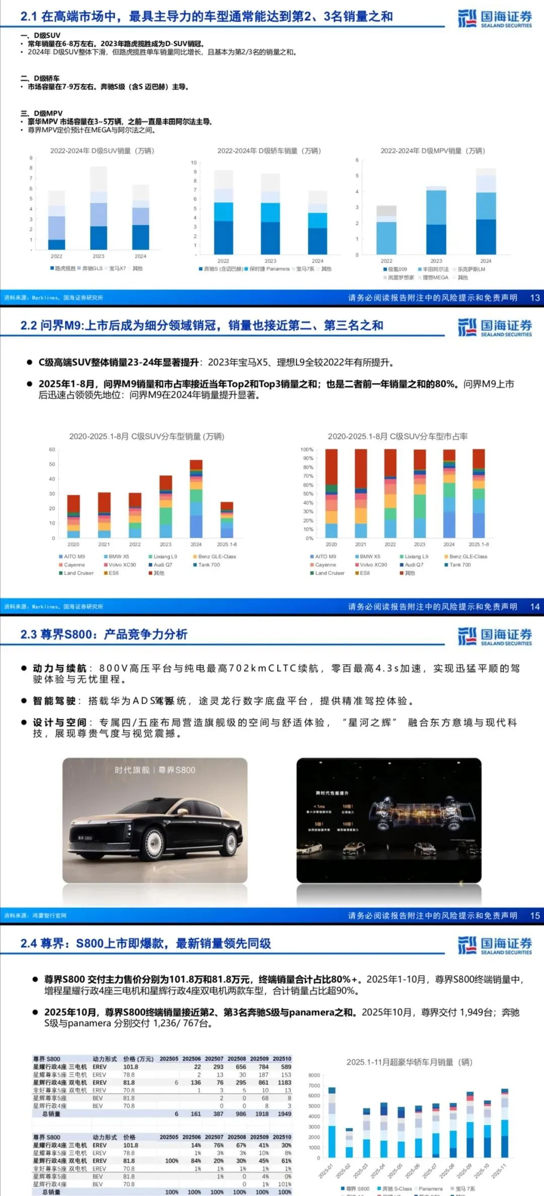 超豪市场年销量稳定在15-20万辆,与整体乘用车市场关联度低,核心受供给驱动。目前60万元以上市场仍由欧美品牌主导,但自主份额持续提升,70-90万元区间市占率已达24.6%,替代空间巨大。尊界S800上市即爆款,2025年10月销量接近奔驰S级与Panamera之和,后续MPV、SUV车型补全后,远期年销有望冲击10万辆。