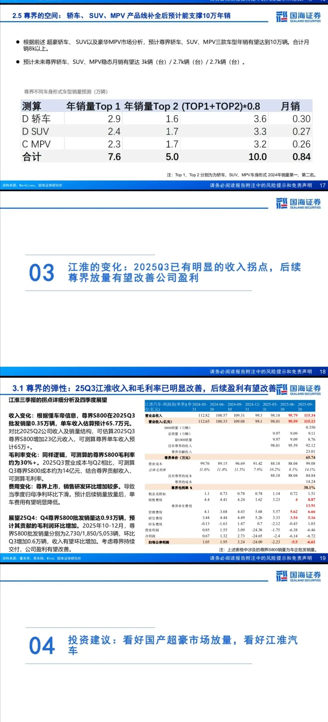 江淮2025Q3已现收入与毛利率拐点,尊界S800单季度贡献23亿元收入,毛利率超30%。2025Q4起尊界进入规模化交付阶段,随着销量放量摊薄费用,公司盈利将逐步改善。自主超豪赛道正迎来突破期,江淮凭借尊界产品力与产能支撑,有望充分受益于市场扩容与份额提升红利。