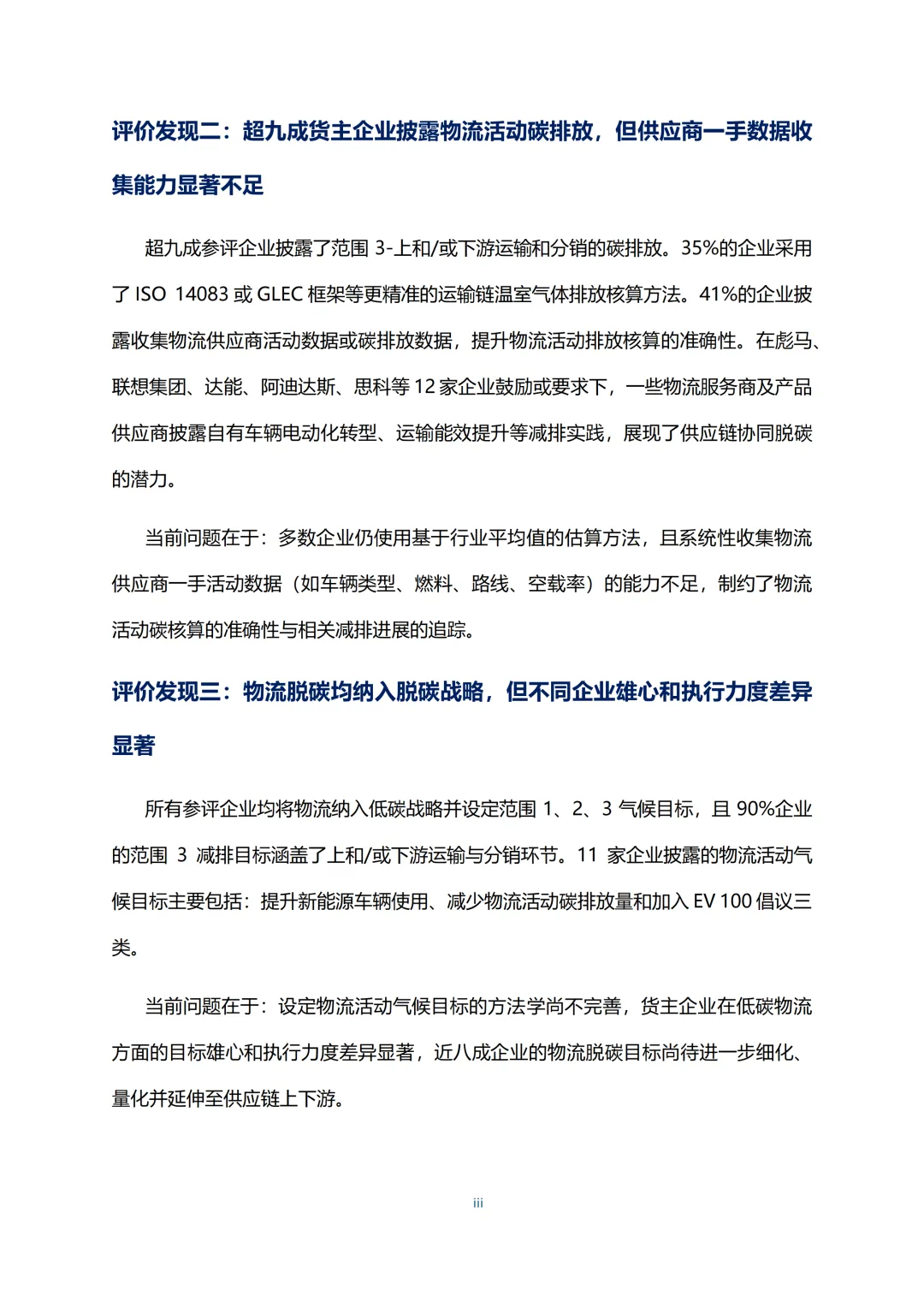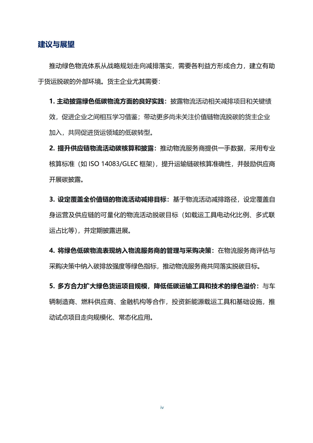 核心是围绕全链条发力,首先要公开披露减排实践与绩效,形成行业示范效应。推动供应商提供一手数据,采用ISO 14083/GLEC专业框架提升碳核算精准度,夯实数据基础。设定覆盖自身及供应链的可量化目标,定期公示进展。将碳排放强度等绿色指标纳入服务商遴选考核,强化倒逼机制。联合多方利益相关方投资新能源基础设施,降低绿色溢价,让试点项目走向规模化应用,破解行业发展瓶颈。