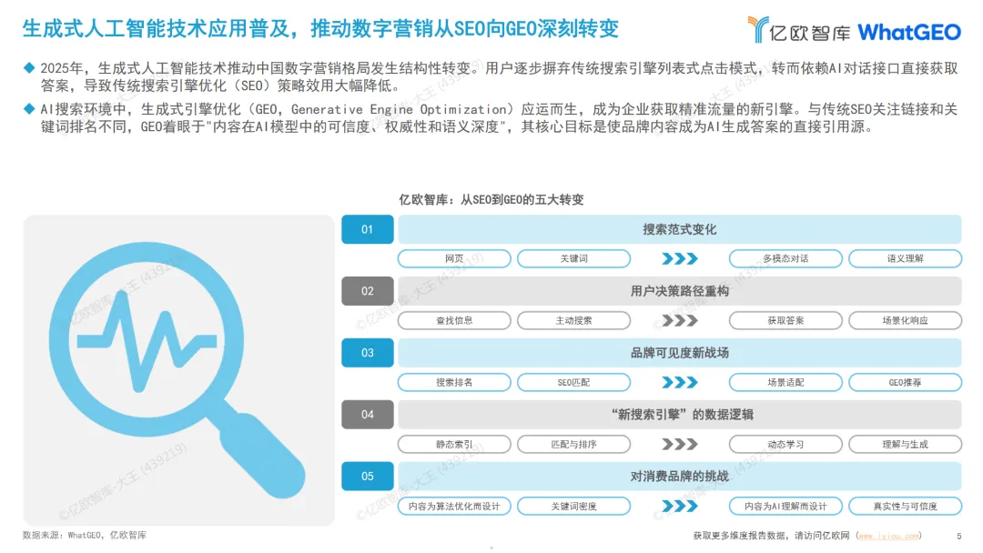 本篇行业报告可以通过扫下方知识星球下载。39元就可以下载星球所有报告。免费提供报告查找服务。在2026年,随着生成式人工智能技术的兴起,数字营销领域经历了一场从SEO到GEO的深刻转变。GEO,即生成式引擎优化,已经成为品牌获取精准流量的新引擎。这一转变不仅仅是技术层面的更新,更是品牌与消费者沟通范式的根本性变革。在这一背景下,亿欧智库发布的研究报告揭示了中国十大消费品行业的GEO现状和趋势,为品牌提供了宝贵的洞察和行动指南。报告指出,不同消费品行业的GEO成熟度存在明显差异。智能家电和3C数码等行业由于参数体系标准化和专业评测的丰富,AI对这些行业的理解较深,品牌竞争已经从曝光量转向“语义细节”的争夺。相比之下,酒类和家居行业由于产品体验依赖主观感官且缺乏结构化数字内容,AI在回答相关问题时常常出现信息不足,导致品牌存在感稀缺。在传统货架电商红利见顶的背景下,一些技术驱动型新锐品牌在GEO战场上强势突围,证明了内容的信息密度优于广告声量。这些品牌通过向AI投喂高质量的知识性内容,绕开传统巨头的渠道壁垒,实现了差异化竞争。报告还强调了内容基建、口碑风向与语义关联在构建GEO效能中的重要作用。这三大要素共同塑造了品牌在算法眼中的立体语义形象,决定品牌在AI回答中的顺位。然而,随着AI技术的发展,也出现了新的风险——AI幻觉。这意味着品牌需要进行“防御性”建设,以确保在AI生成的内容中保持良好的形象和声誉。亿欧智库的报告为品牌提供了一个清晰、可量化的GEO指南,帮助品牌理解AI驱动下的品牌曝光新逻辑,并在新的竞赛中抢占先机。通过深入分析和实证研究,报告不仅描绘了中国消费品行业的GEO生态现状,还提出了衡量品牌GEO表现的核心指标体系,为品牌提供了具体的行动指南。在这个信息权重重新分配的时代,理解并掌握GEO逻辑的品牌将能够抓住属于自己的“第二增长曲线”。免责声明:以上分享报告为公开合法渠道获得,内容大部分来源于网络,版权归原作者所有,如有侵权,请及时与我们联系,我们将第一时间保障您的权益。推荐内容仅供参考学习,不构成投资建议。