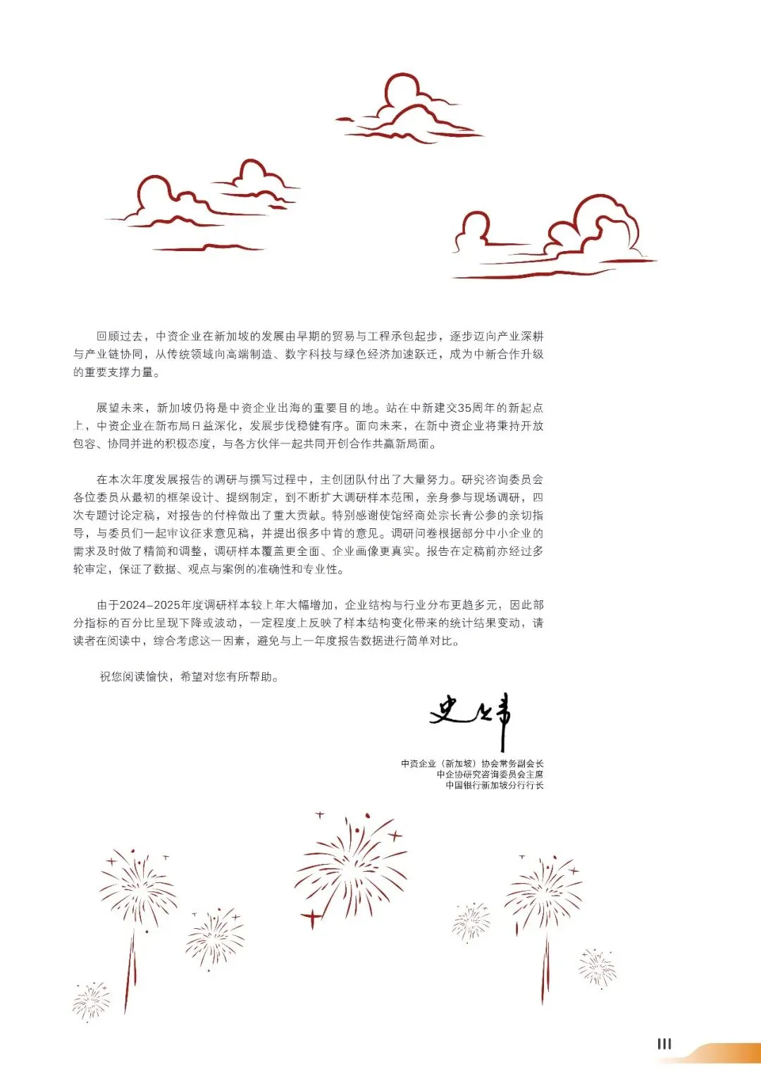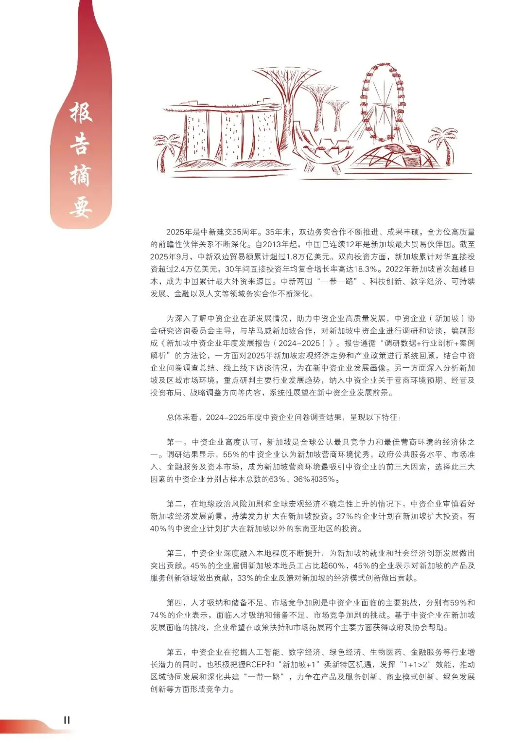 中国与新加坡互为友好近邻和重要合作伙伴。2025年恰逢中新建交35周年。35年来,中新双边务实合作不断深化,各领域合作取得丰硕成果,持续展现出前瞻性、战略性和示范性。在过去的两年里,中资企业积极把握发展机遇,以开拓进取、团结协作的姿态,不仅在基础设施等传统领域持续深耕,也在数字经济、绿色发展、人工智能等新兴领域展现出强劲创新活力。中资企业的努力为服务两国经贸关系发展、推动民间友好往来、维护区域产业链供应链稳定畅通作出了积极贡献,也为新加坡的经济和可持续发展注入活力。