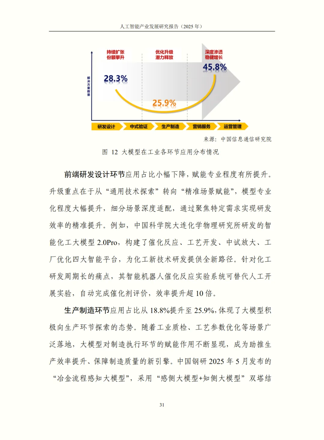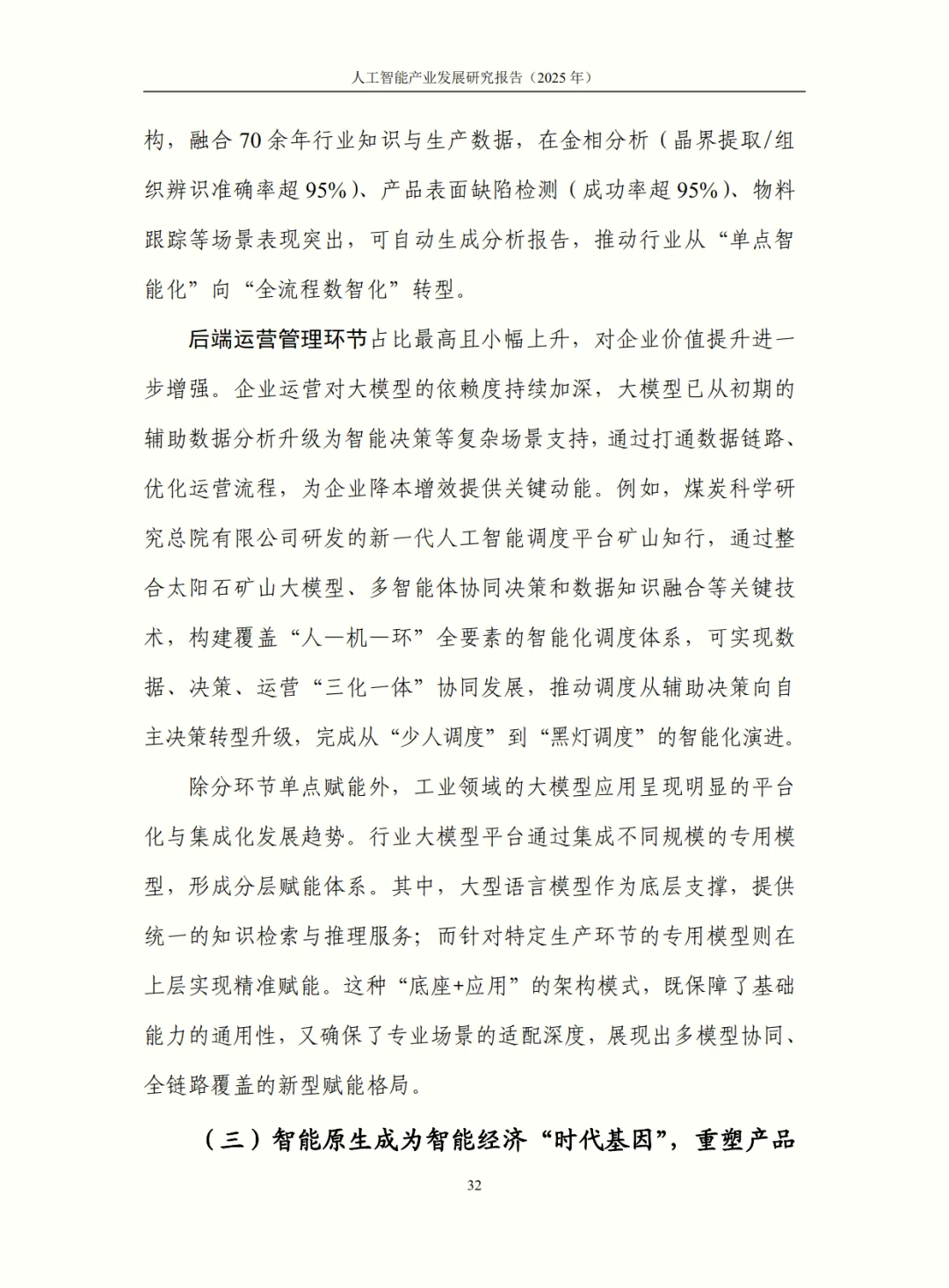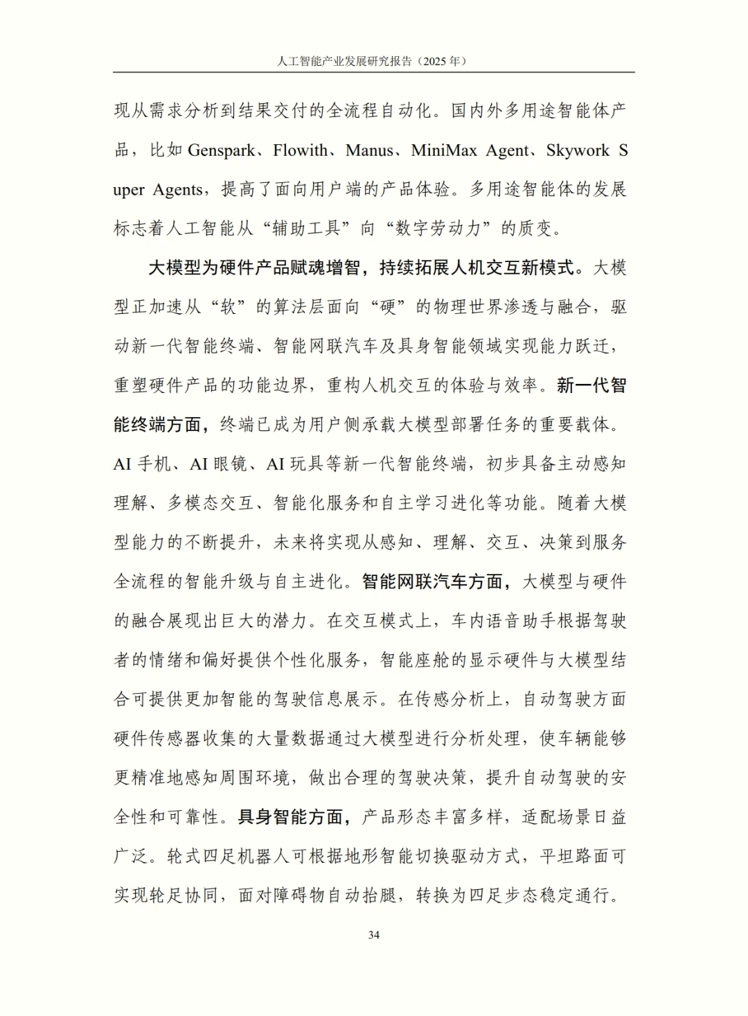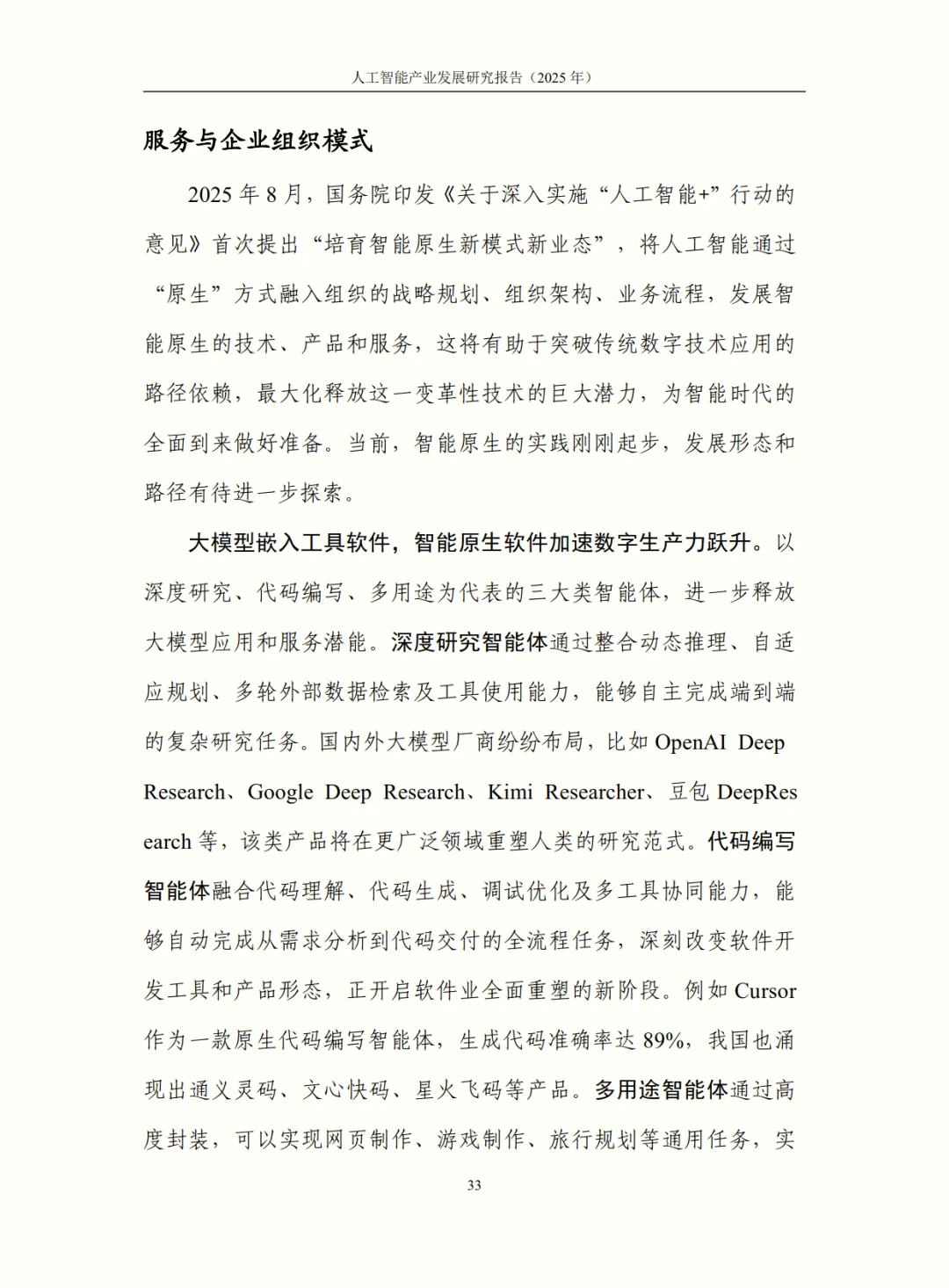 在应用层面,人工智能加速向一二三产业高附加值环节渗透,农业领域构建数字孪生与智慧农机体系,工业全环节智能化转型催生百余种新模式,服务业以智能原生重塑客户体验与运营效率;尤其在新型工业化进程中,大模型深度赋能研发设计、生产制造与运营管理,实现“两端深化、中间突破”的链式升级。智能原生成为智能经济的“时代基因”,大模型嵌入工具软件与硬件终端,催生深度研究、代码编写、多用途智能体等数字劳动力新形态,并推动企业架构向人机协同的扁平化网络演进。