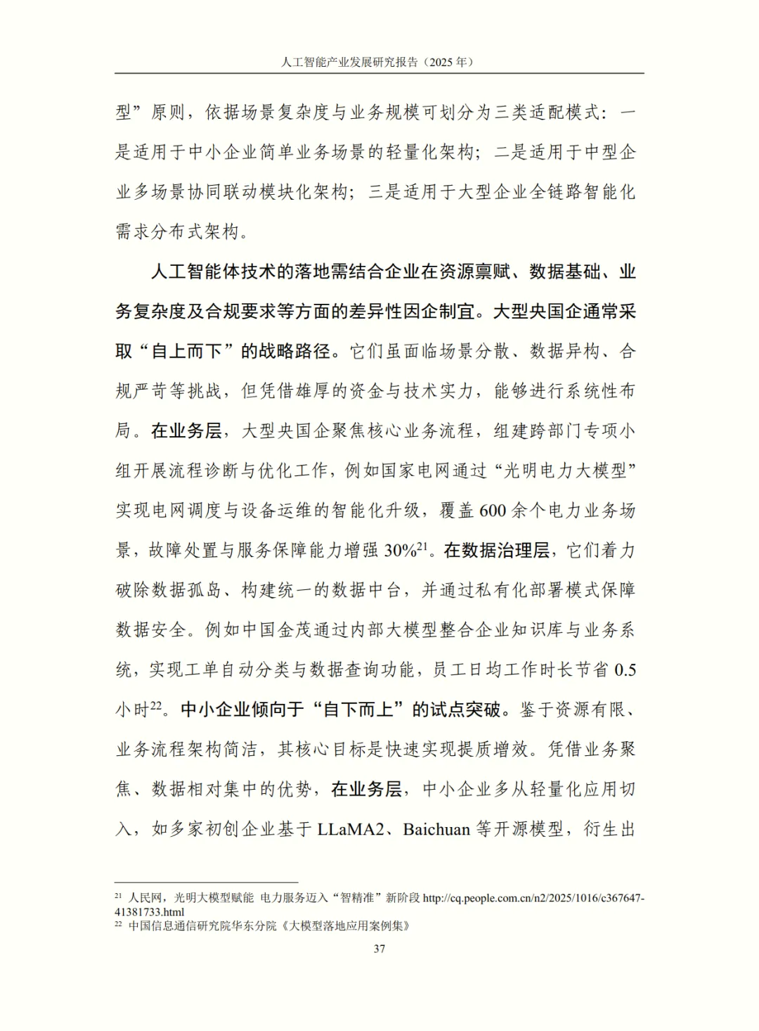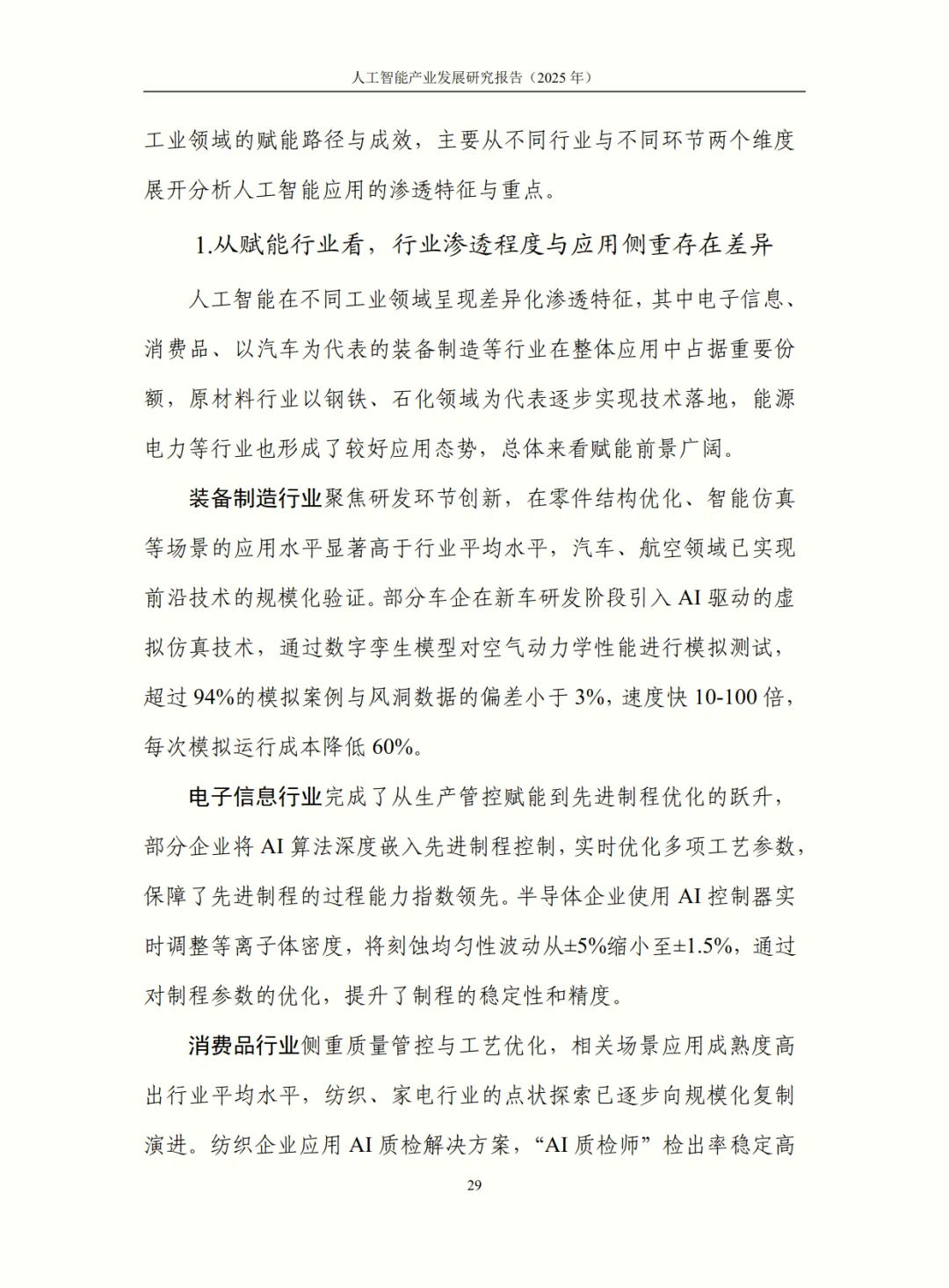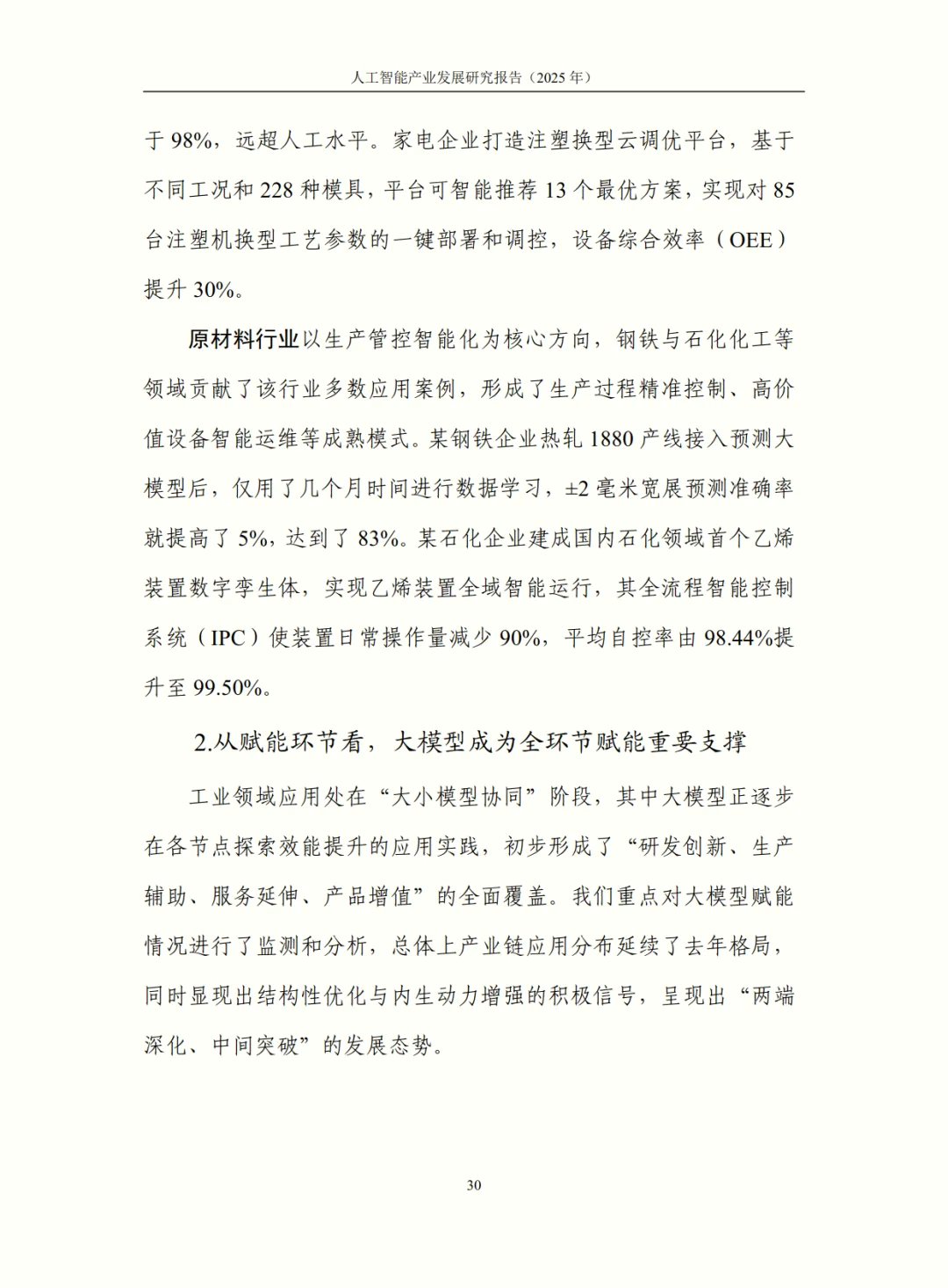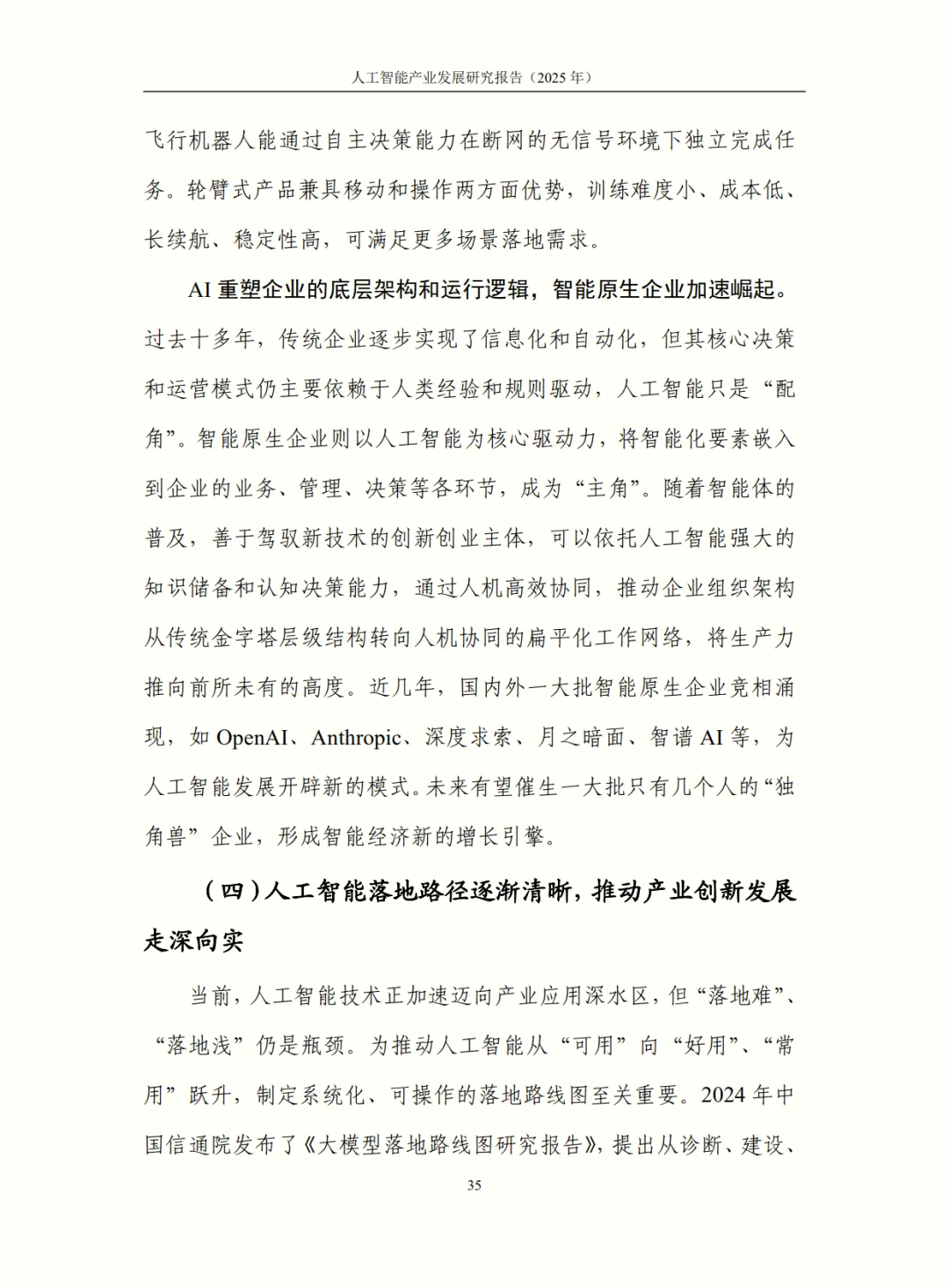 在应用层面,人工智能加速向一二三产业高附加值环节渗透,农业领域构建数字孪生与智慧农机体系,工业全环节智能化转型催生百余种新模式,服务业以智能原生重塑客户体验与运营效率;尤其在新型工业化进程中,大模型深度赋能研发设计、生产制造与运营管理,实现“两端深化、中间突破”的链式升级。智能原生成为智能经济的“时代基因”,大模型嵌入工具软件与硬件终端,催生深度研究、代码编写、多用途智能体等数字劳动力新形态,并推动企业架构向人机协同的扁平化网络演进。