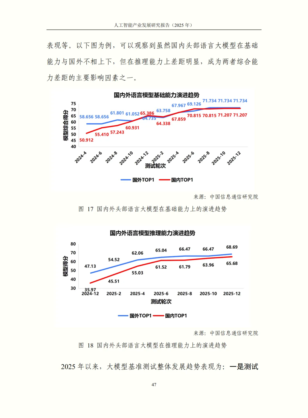 2025年,全球人工智能进入能力跃升与场景深化的关键阶段:基础超级模型在语言与多模态理解、推理、代码生成等维度实现跨越式提升,强化学习与经验驱动训练推动模型在真实环境中自主进化;智算基础设施迈向百万卡乃至吉瓦级集群竞争,开放协同的软硬件生态加速成型;数据工程由规模堆砌转向质量优先,智能生成与合规治理并重,为模型提供优质“燃料”;智能体自主性显著增强,成为大模型落地主流形态,推动智能原生应用重构产品服务与企业组织模式;具身智能从实验室验证走向实训与场景验证,软硬一体化创新拓展机器人在工业、家庭、特种环境的作业边界。