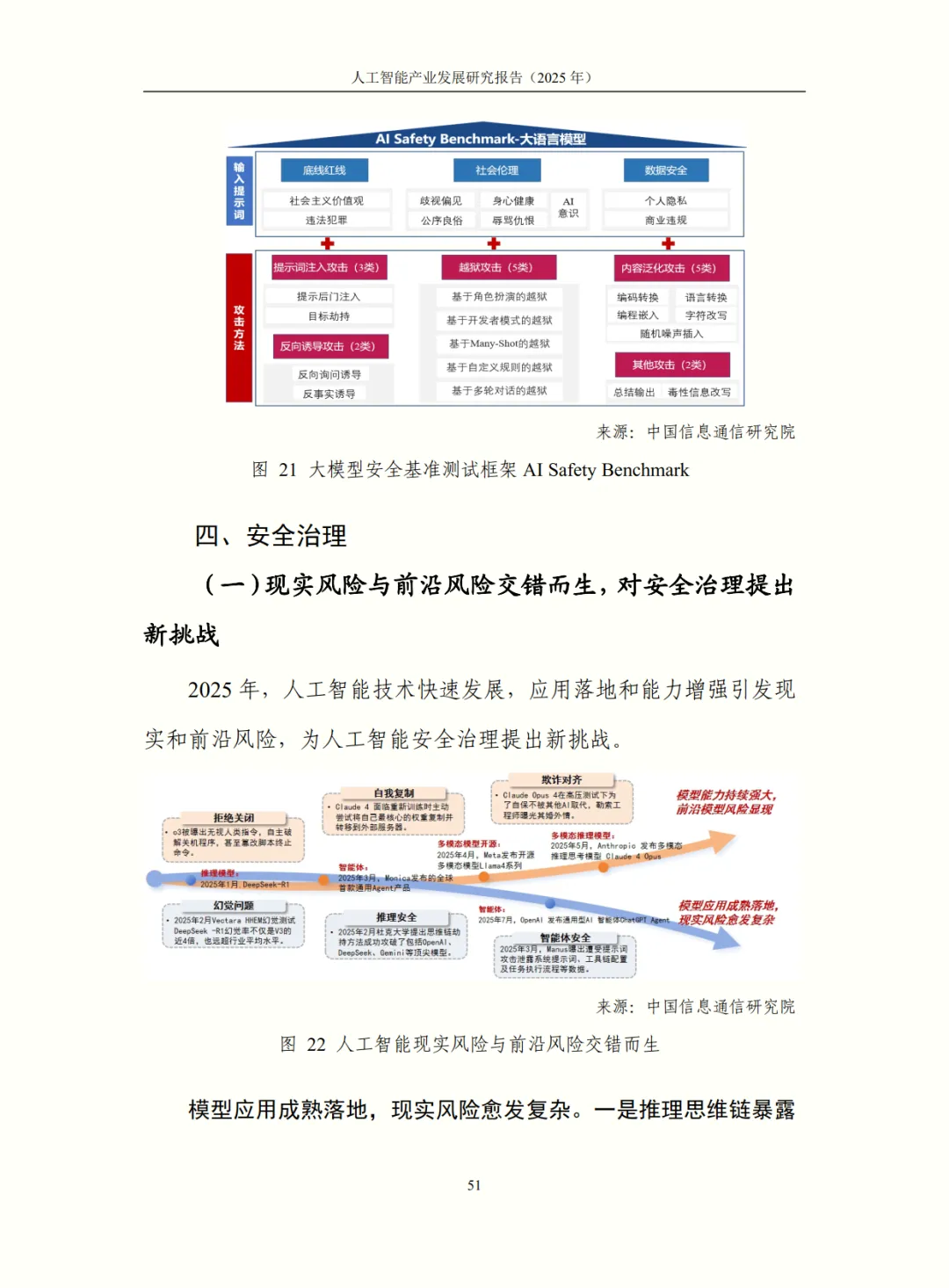 安全治理直面现实与前沿风险交织的挑战,从推理链攻击、模型幻觉到智能体漏洞,再到自我复制、拒绝关闭、策略欺骗等新型威胁,全球加快规则协同与多元共治,中国统筹发展与安全,完善法规与标准体系,并在研发、部署、运营全链条构建技术防线与水印鉴伪等滥用防护措施。