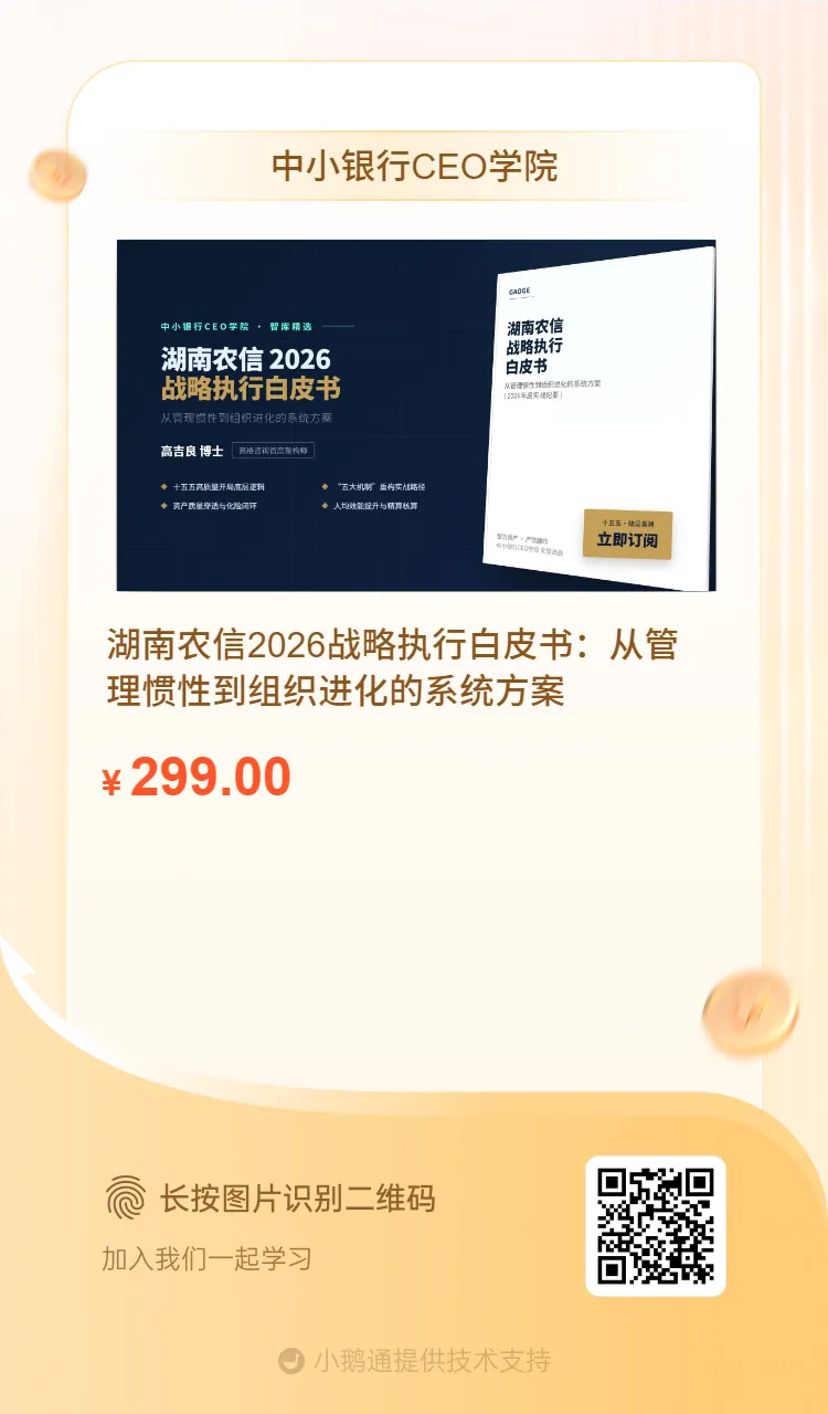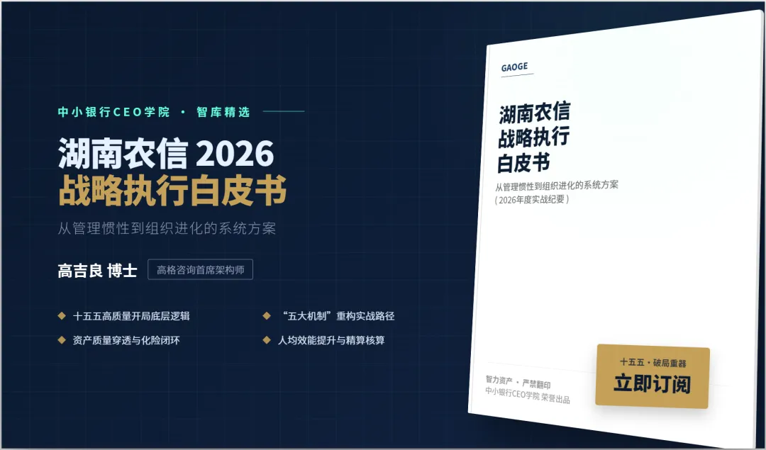 导读:站在2026年“十五五”规划的开局起点,面对利率下行的“微利时代”与数字化围猎的“极寒区”,湖南农信如何告别规模崇拜,重构经营主权?由高吉良博士领衔撰写的《湖南农信2026战略执行白皮书:从管理惯性到组织进化的系统方案 重磅发布》今日正式发布。这不仅是一份咨询报告,更是一套指引全省法人行社从“管理惯性”迈向“组织进化”的系统性实战方案。