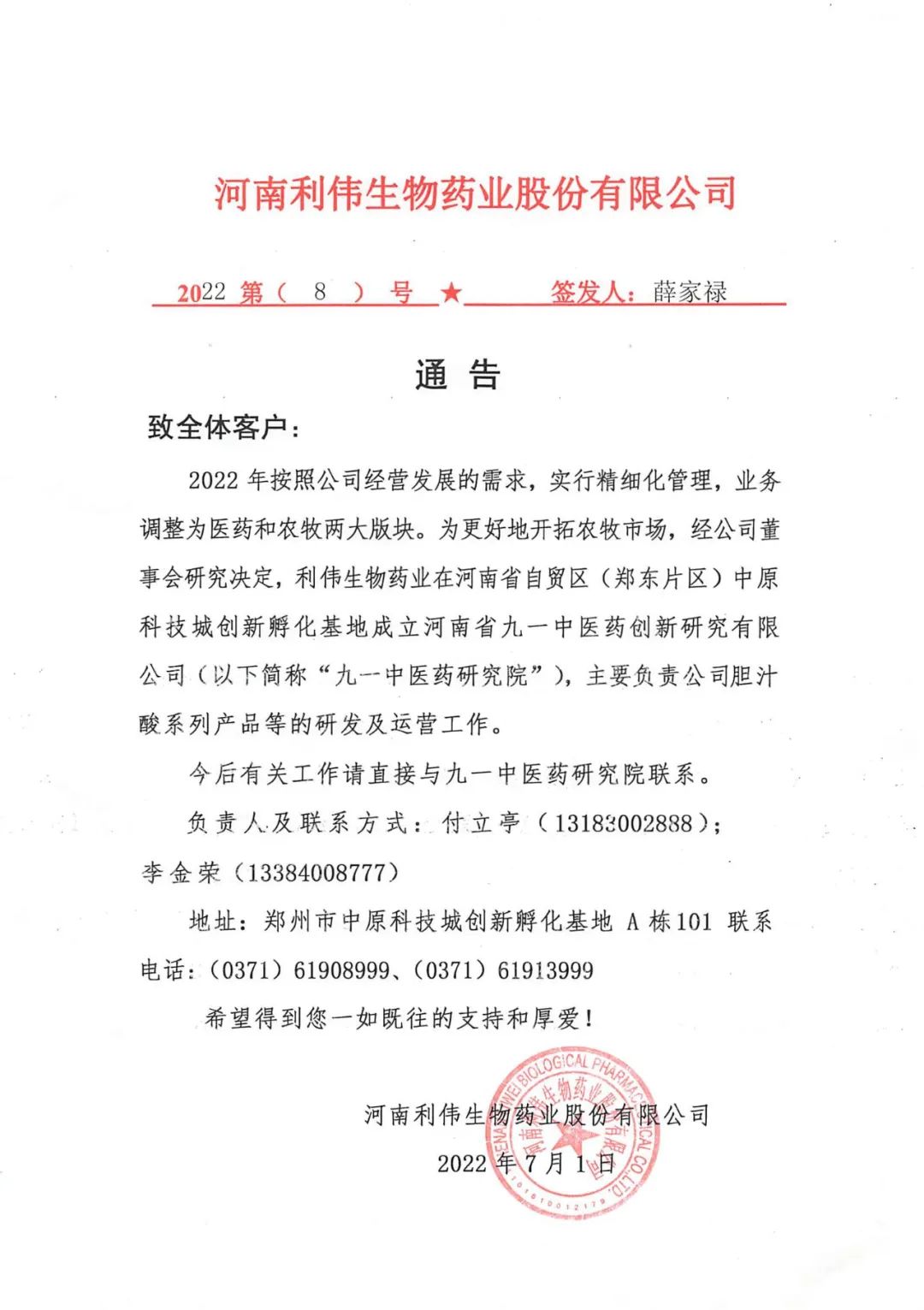 随着公司经营发展的需求,业务板块实行更精细化的管理,分医药、食品和畜牧三大板块。2022年在河南省自贸区(龙湖片区)中原科技城创新孵化基地成立河南省九一中医药研究院,旨在进一步系统的研究、开发畜牧板块胆汁系列相关产品。