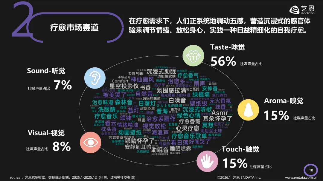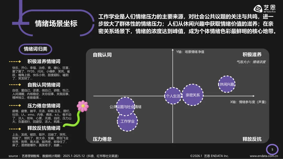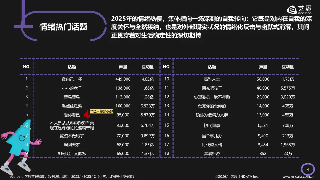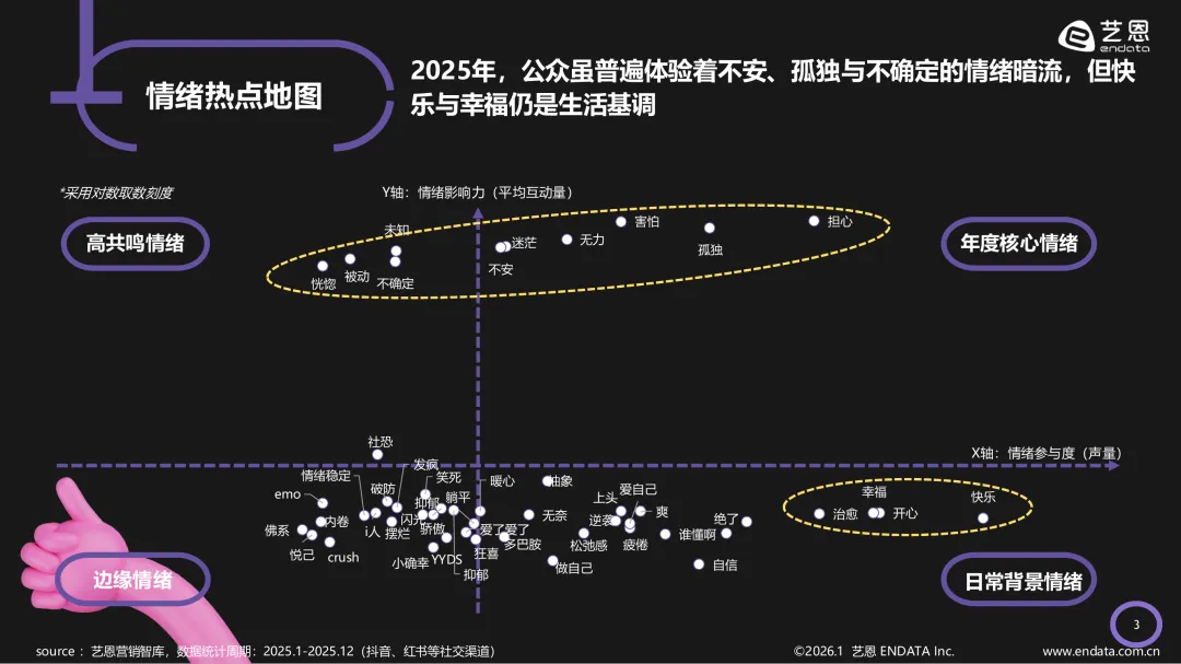 2025年,社会对情绪的关注持续升温,公众在面对不安、孤独与不确定感的仍普遍感受到快乐与幸福的基调。情绪话题在社交平台上呈现出多样化特征,既有高共鸣的情绪如孤独、不安和迷茫,也有边缘情绪如抑郁和疲惫。情绪表达方式更加丰富,从直接倾诉到幽默调侃,体现出个体对自我情感的深度探索与外部现实的互动。这一年,情绪热点呈现明显趋势,许多热门话题围绕自我关怀与生活态度展开,反映出人们在压力环境中寻求心理平衡的努力。例如,“敬自己一杯”“爱你老己”等话题获得广泛传播,展现出个体对自身价值的认可与肯定。一些话题以轻松或讽刺的方式回应现实困境,如“被资本做局了”“误闯天家”,表现出对社会现象的反思与情绪宣泄。情绪表达不仅限于语言层面,还通过行为和生活方式体现,如“多巴胺”“松弛感”“躺平”等概念成为流行词汇,反映出人们对生活节奏与内心状态的重新定义。情绪疗愈需求日益增长,推动相关产品和服务不断升级,形成更具针对性和个性化的解决方案。这一趋势表明,情绪管理正从个人层面扩展至更广泛的社会文化领域。