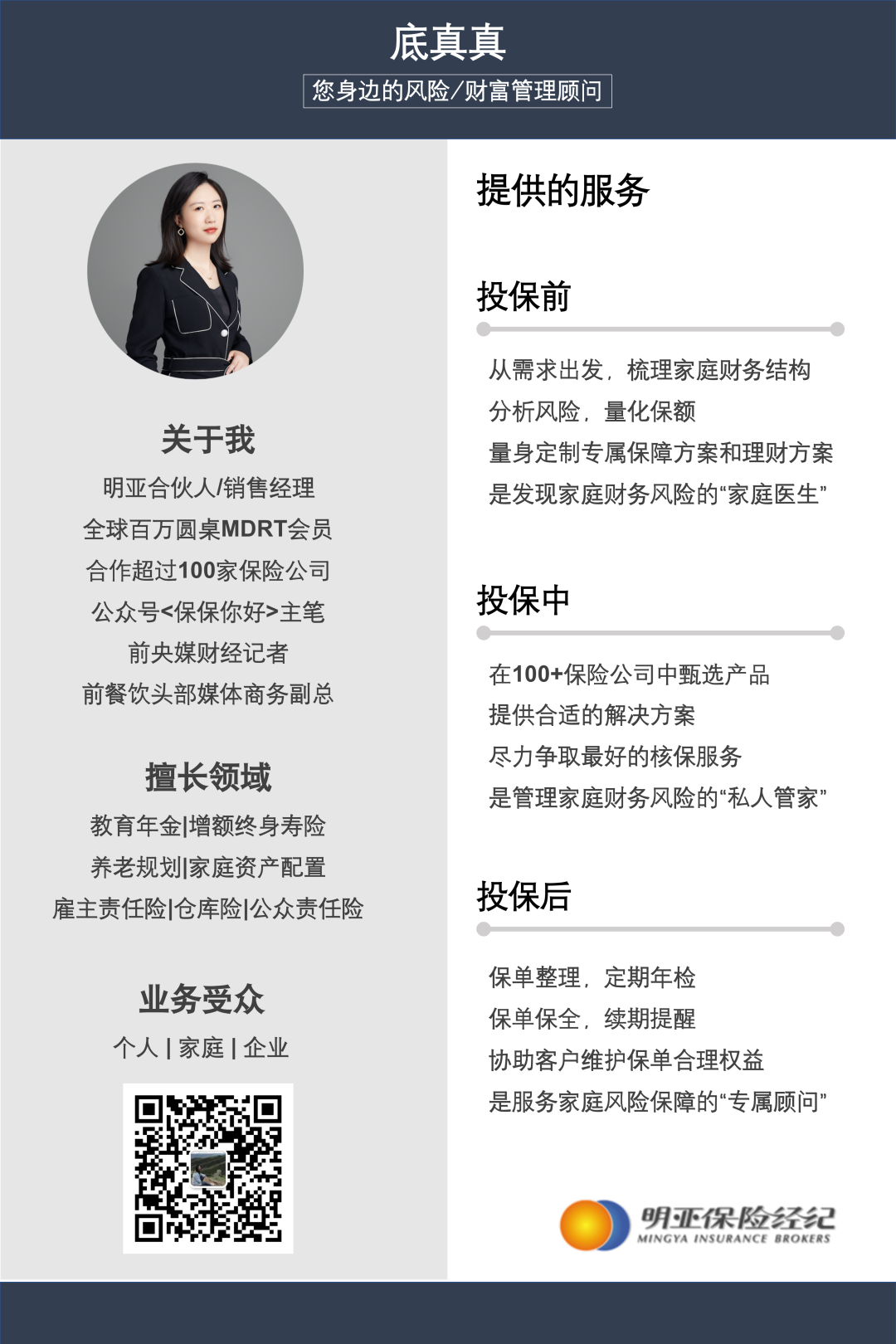 我们是来自明亚保险经纪股份有限公司,专注为中产及高净值家庭提供风险管理服务的团队,成员大量来自于北京大学、中山大学、厦门大学、华南理工、南开大学、哈工大等一流学府的博士及硕士,曾就职于500强外企/央企国企/三甲医院等,集合了金融、法律、医学等丰富经验和背景。欢迎咨询/加入我们。