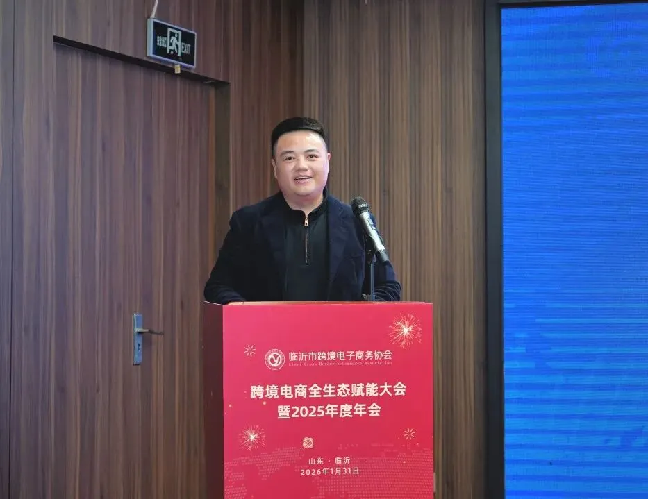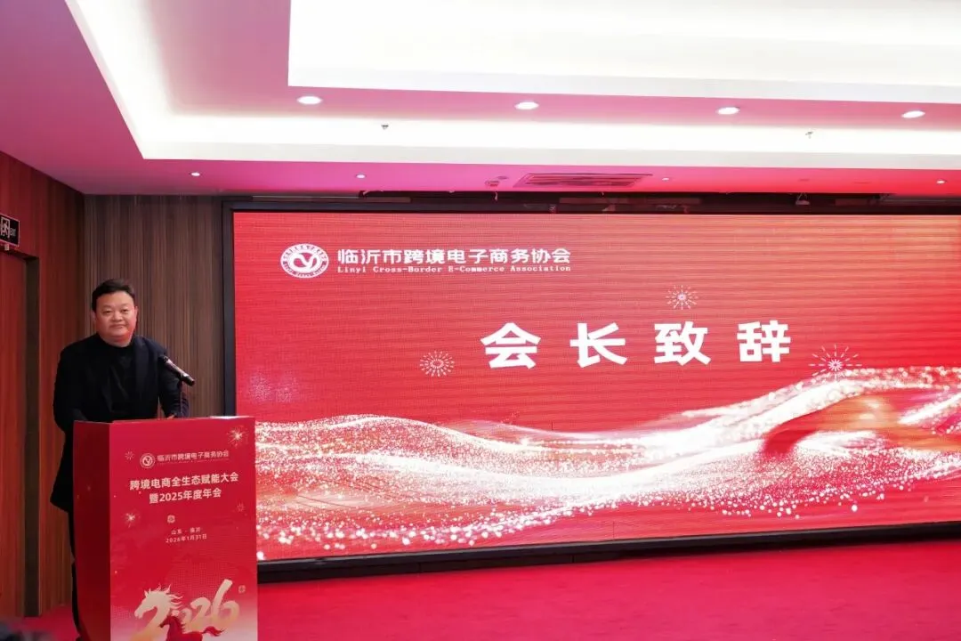 2026年1月31日,临沂市跨境电子商务协会全生态赋能大会暨2025年度年会于临沂世尊伯爵国际酒店成功举行。山东兰华集团党委副书记、副董事长、执行总裁刘建作为协会会长、山东兰华跨境电子商务有限公司(以下简称:兰华跨境)总经理蔺天一作为协会秘书长出席此次会议。