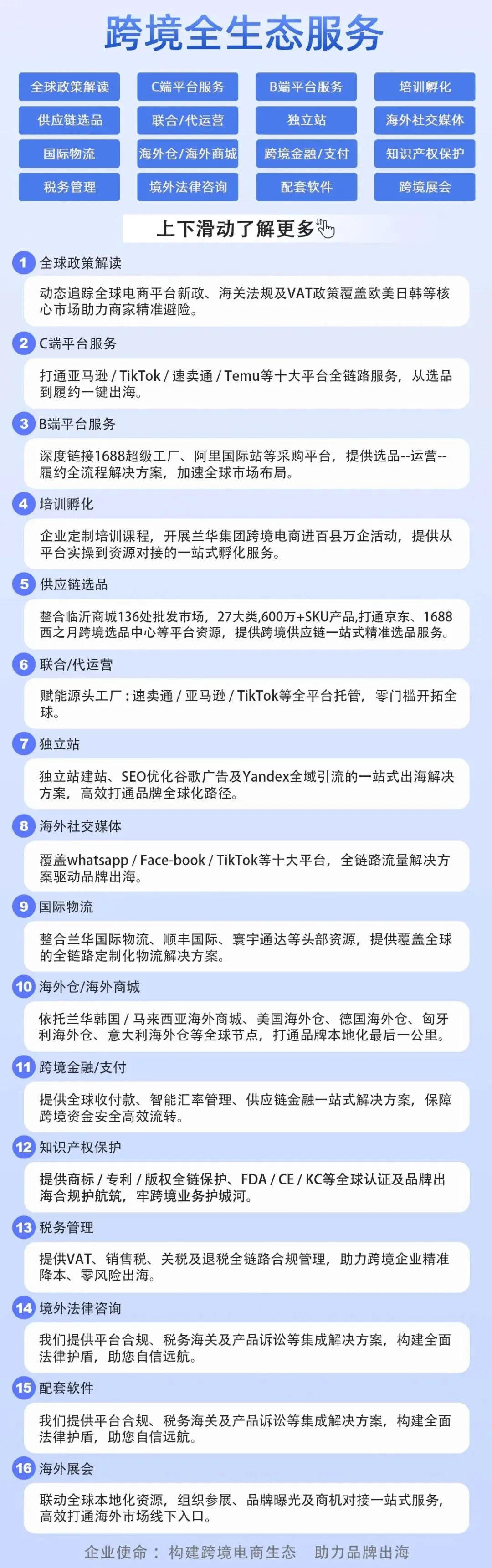 未来,兰华跨境将继续围绕企业出海各阶段的核心痛点,整合物流通关、独立站建设、品牌营销与本地化运营等资源,为企业提供贯穿市场进入、规模增长与品牌深耕全周期的陪伴式出海服务,助力更多“临沂智造”走向“临沂品牌”,在全球市场中实现可持续成长。