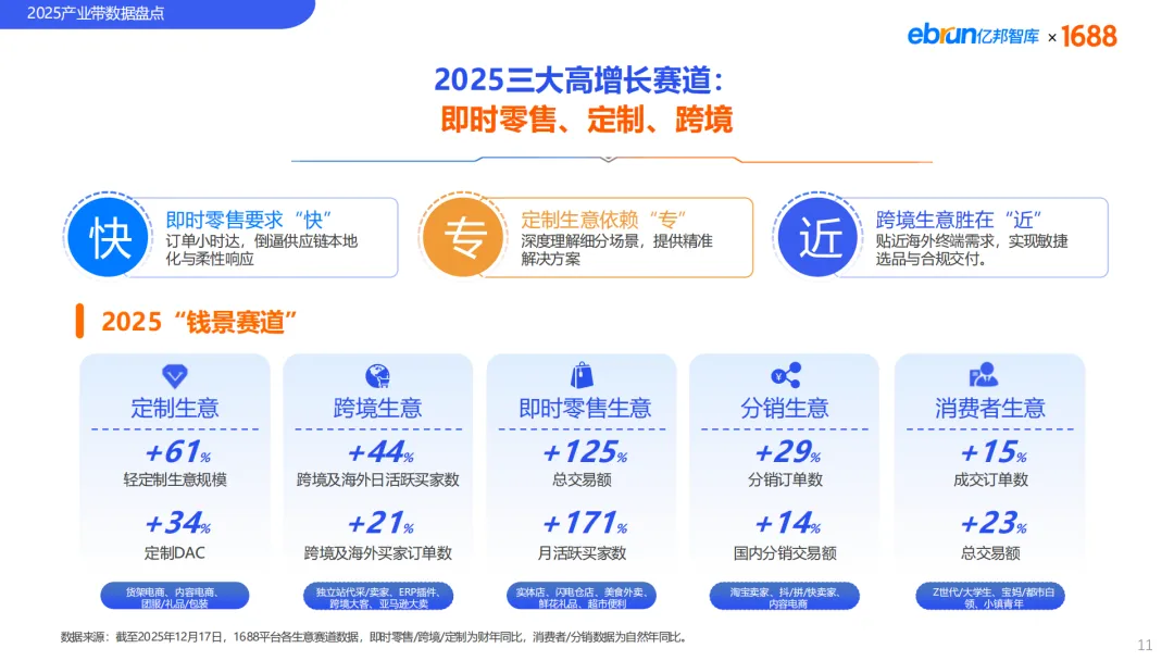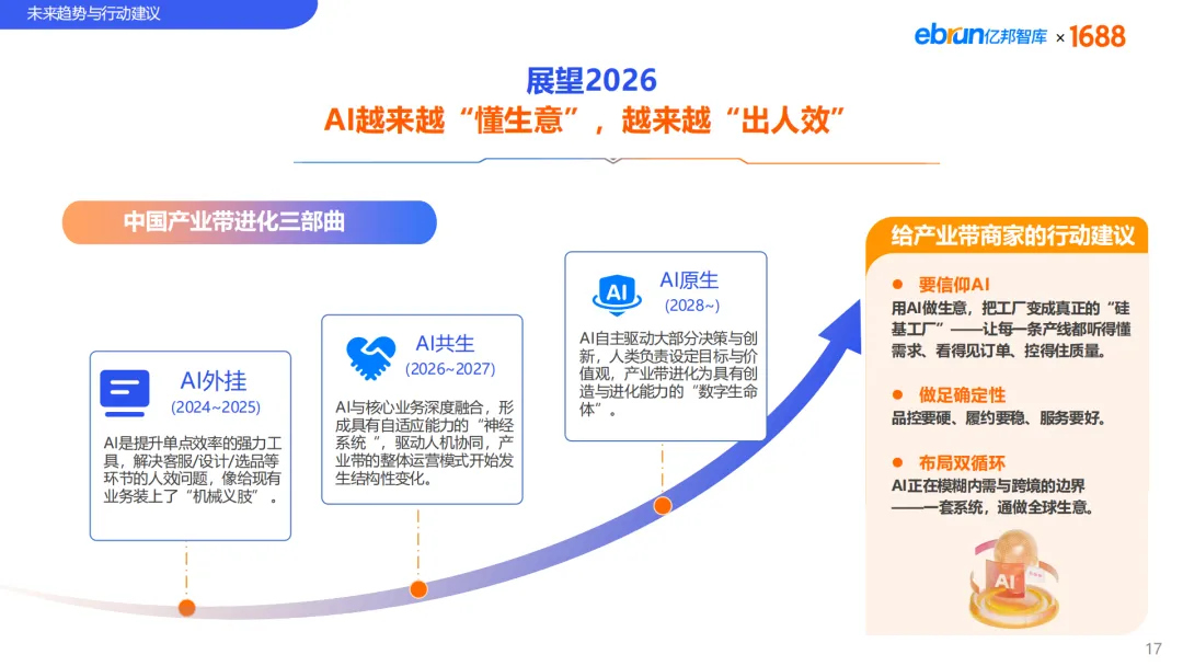 这份《2025中国产业带发展趋势报告》由亿邦智库发布,核心观点是中国产业带正从“数字化”迈向“AI原生”时代,AI不再是简单的增效工具,而是成为重塑供应链、驱动产业智能化的核心力量。
