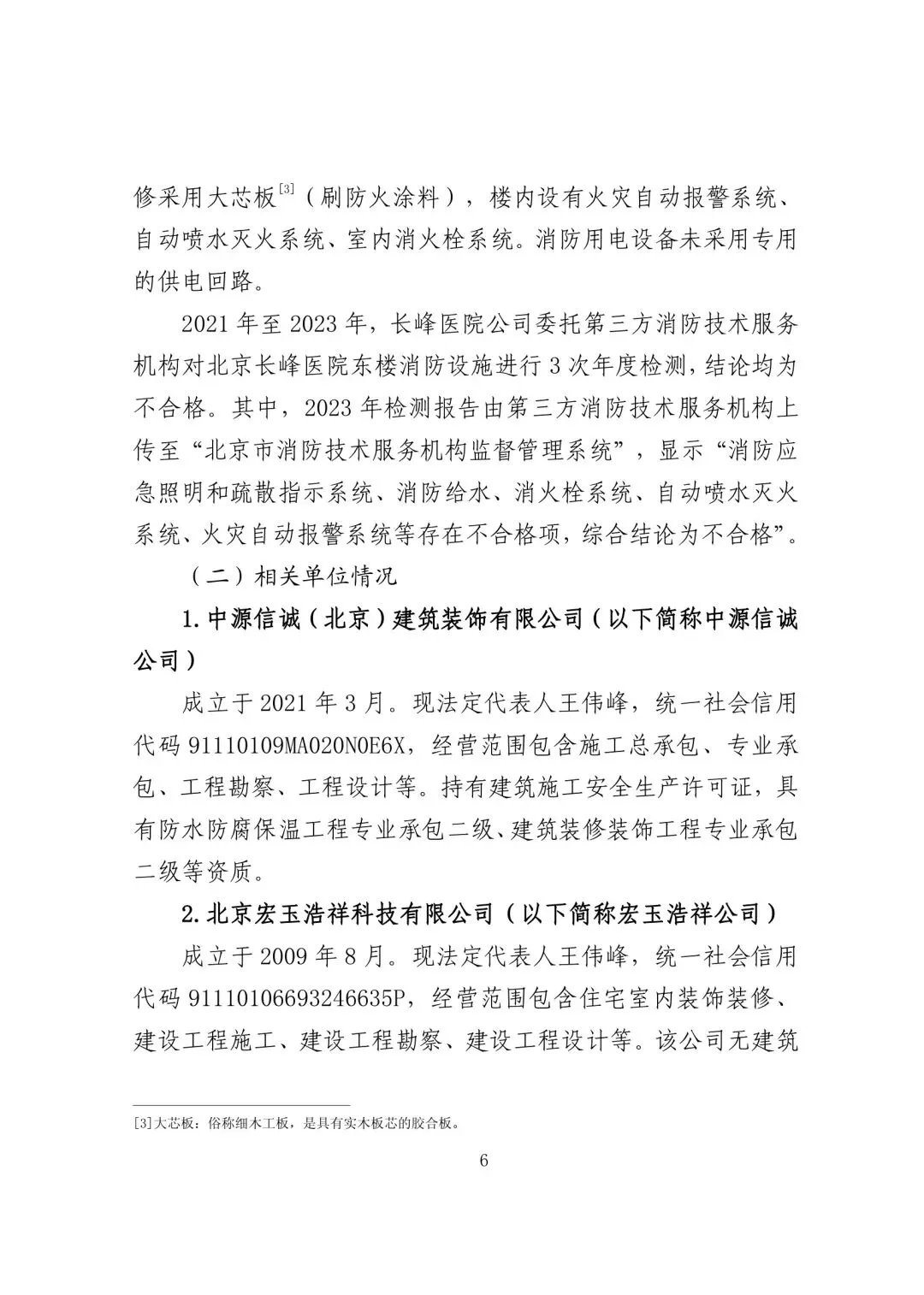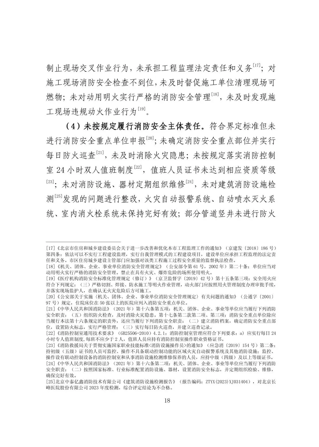 2021 年至 2023 年,长峰医院公司委托第三方消防技术服务机构对北京长峰医院东楼消防设施进行 3 次年度检测,结论均为不合格。其中,2023 年检测报告由第三方消防技术服务机构上传至“北京市消防技术服务机构监督管理系统”,显示“消防应急照明和疏散指示系统、消防给水、消火栓系统、自动喷水灭火系统、火灾自动报警系统等存在不合格项,综合结论为不合格”。