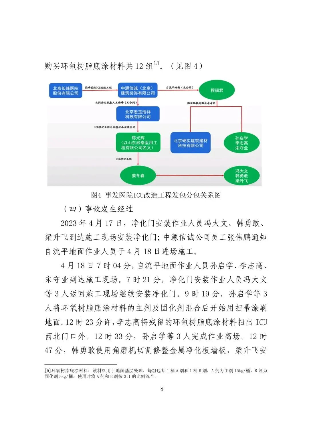 2023 年 3 月 23 日,王伟峰未经长峰医院公司认可,以宏玉浩祥公司名义将北京长峰医院 ICU 净化工程及吊桥设备安装分包给陈光辉。陈光辉以淞泰公司名义与宏玉浩祥公司签订合同(合同签名处为陈光辉)。淞泰公司未参与实际施工,将收取的工程款全部转至陈光辉个人账户。