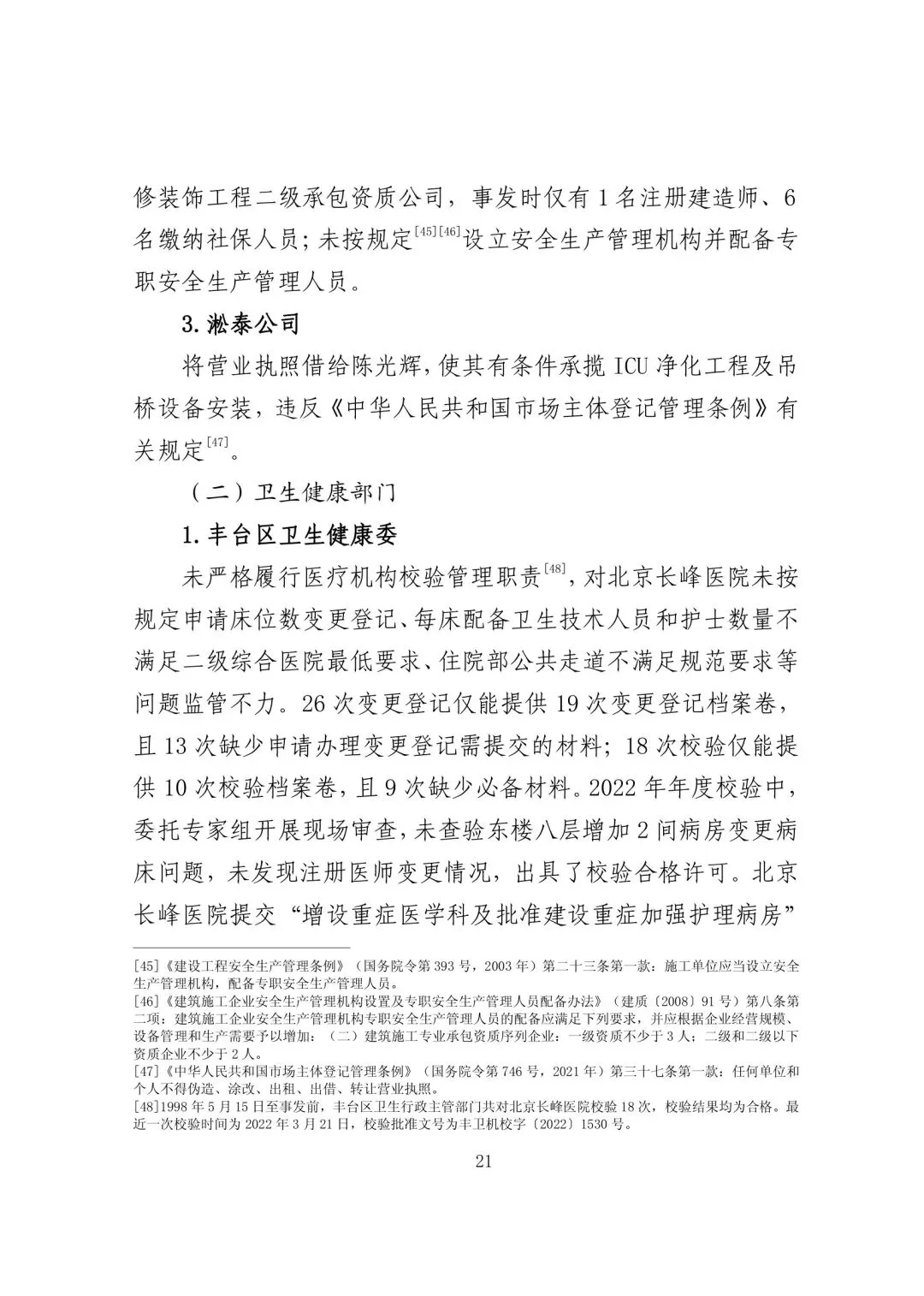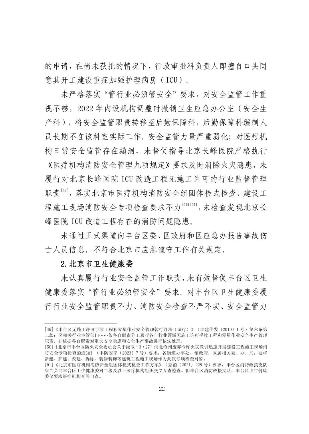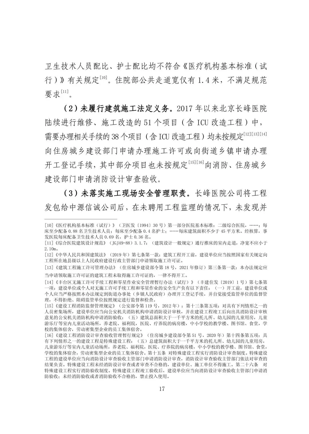 a. 未履行建筑施工法定义务。2017 年以来北京长峰医院陆续进行维修、施工改造的 51 个项目(含 ICU 改造工程)中,需要办理相关手续的38 个项目(含ICU 改造工程)均未按规定向住房城乡建设部门申请办理施工许可或向街道乡镇申请办理开工登记手续,其中部分项目也未按规定向消防、住房城乡建设部门申请消防设计审查验收。