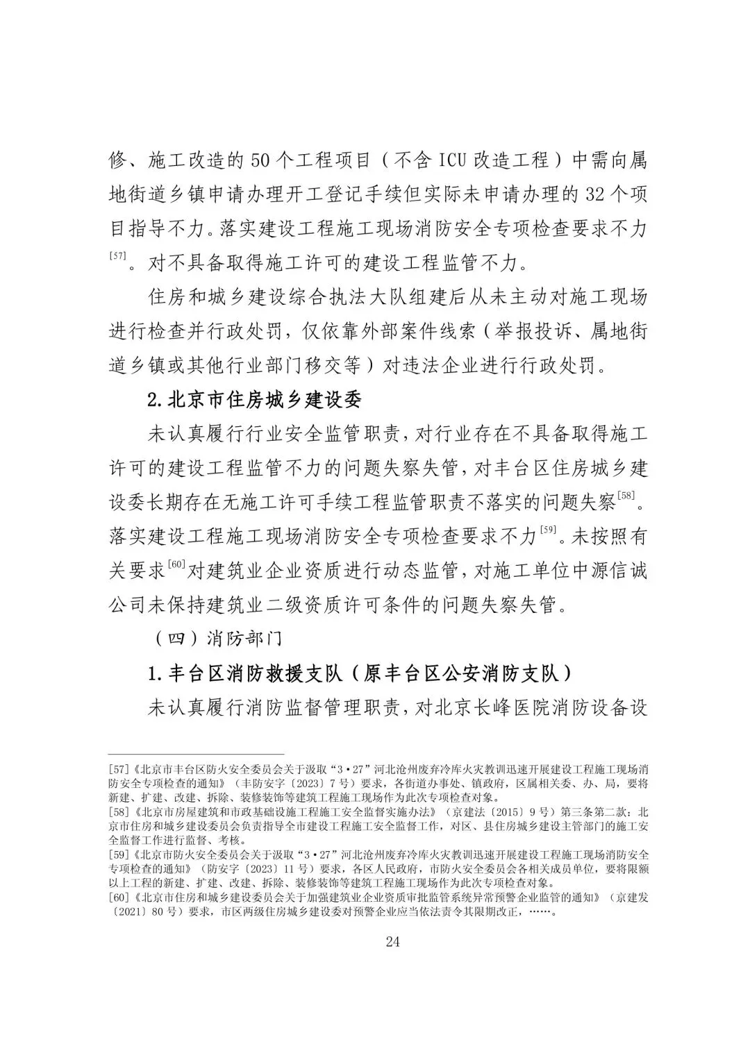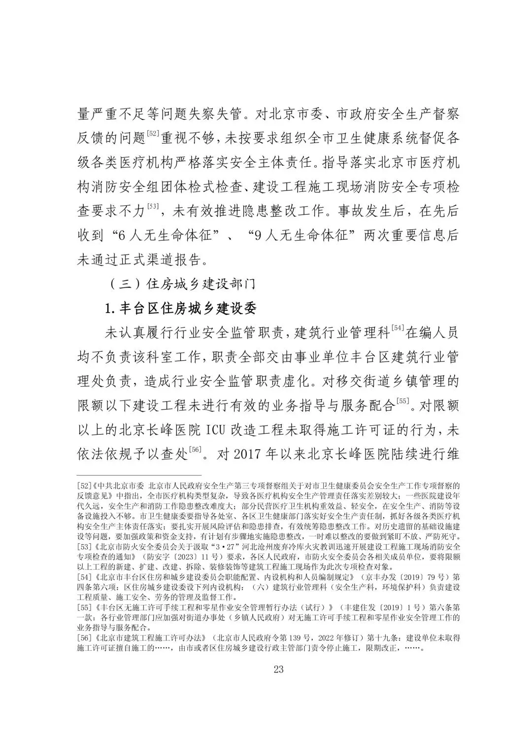 未认真履行行业安全监管职责,建筑行业管理科在编人员均不负责该科室工作,职责全部交由事业单位丰台区建筑行业管理处负责,造成行业安全监管职责虚化。对移交街道乡镇管理的限额以下建设工程未进行有效的业务指导与服务配合。对限额以上的北京长峰医院 ICU 改造工程未取得施工许可证的行为,未依法依规予以查处。对 2017 年以来北京长峰医院陆续进行维修、施工改造的 50 个工程项目(不含 ICU 改造工程)中需向属地街道乡镇申请办理开工登记手续但实际未申请办理的 32 个项目指导不力。落实建设工程施工现场消防安全专项检查要求不力。对不具备取得施工许可的建设工程监管不力。住房和城乡建设综合执法大队组建后从未主动对施工现场进行检查并行政处罚,仅依靠外部案件线索(举报投诉、属地街道乡镇或其他行业部门移交等)对违法企业进行行政处罚。