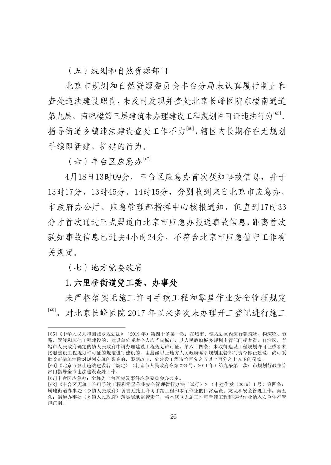 北京市规划和自然资源委员会丰台分局未认真履行制止和查处违法建设职责,未及时发现并查处北京长峰医院东楼南通道第九层、南配楼第三层建筑未办理建设工程规划许可证违法行为。指导街道乡镇违法建设查处工作不力,辖区内长期存在无规划手续即新建、扩建的行为。