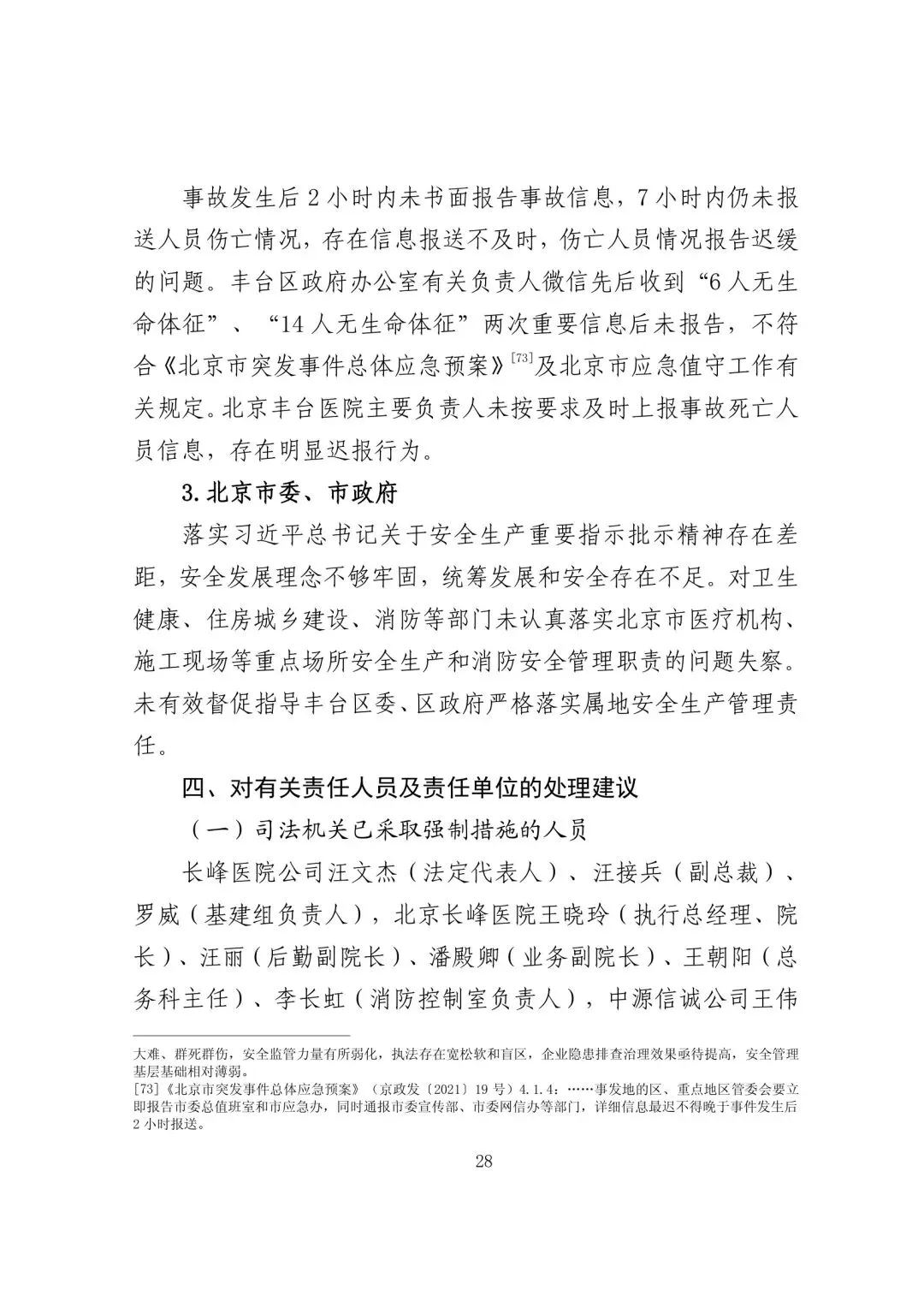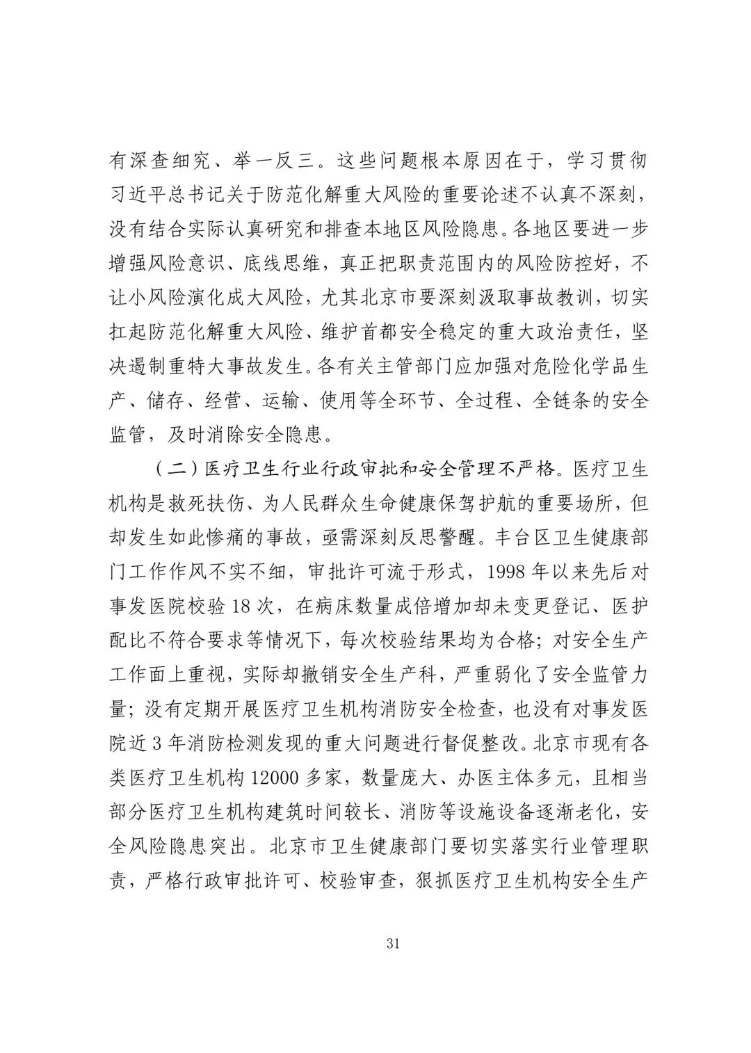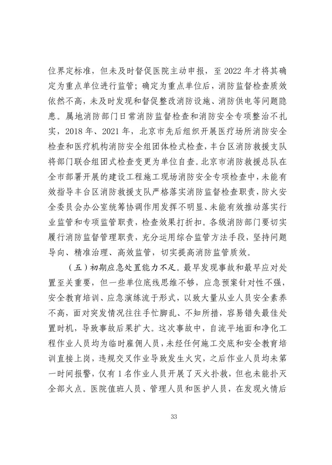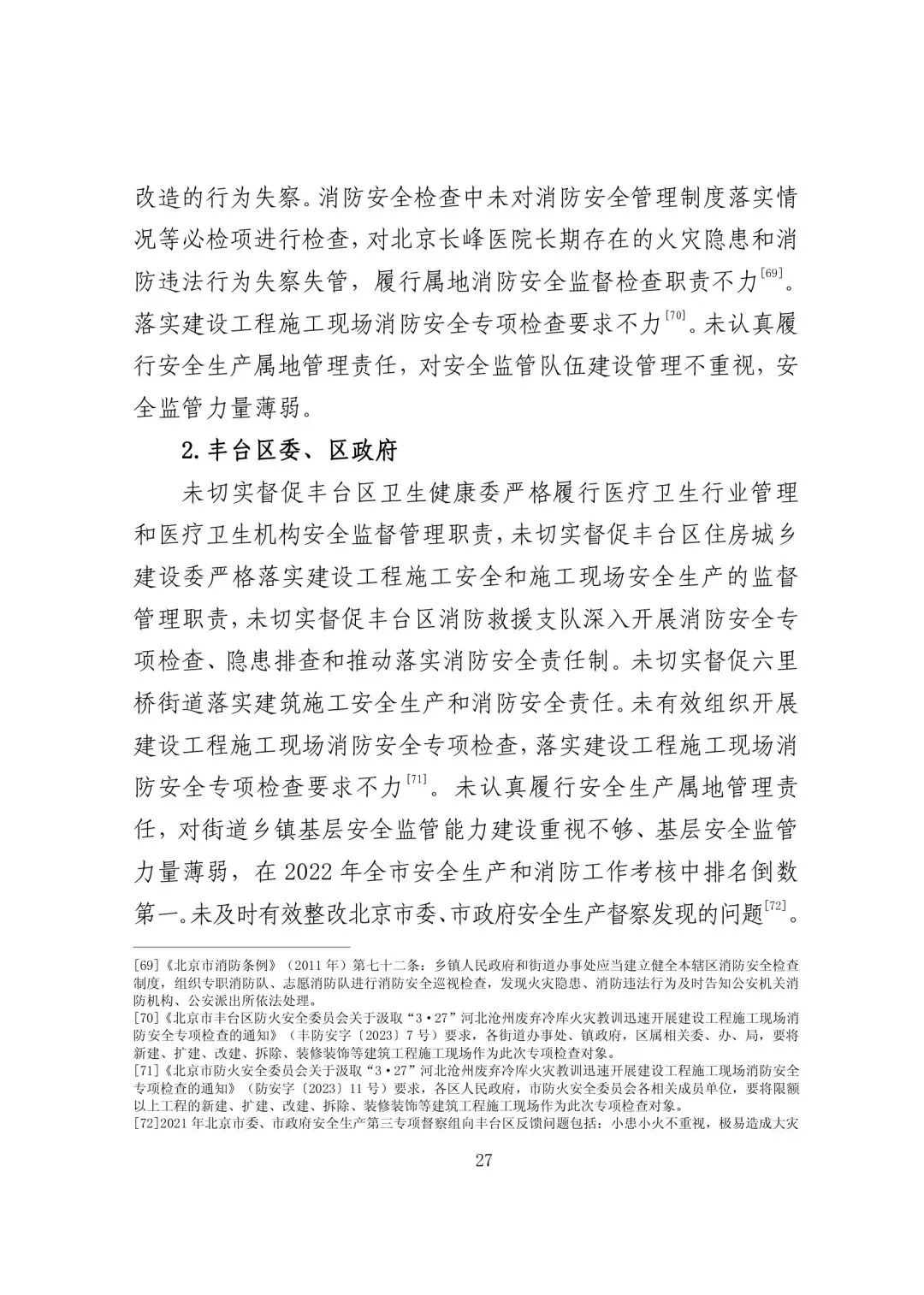未认真履行消防监督管理指导职责,对丰台区消防救援支队(原丰台区公安消防支队)长期以来未将北京长峰医院确定为消防安全重点单位的问题失察。未有效利用消防技术服务机构上传至“北京市消防技术服务机构监督管理系统”中的检测报告。指导落实北京市医疗机构消防安全组团体检式检查、建设工程施工现场消防安全专项检查工作不力,未有效推进隐患整改工作。