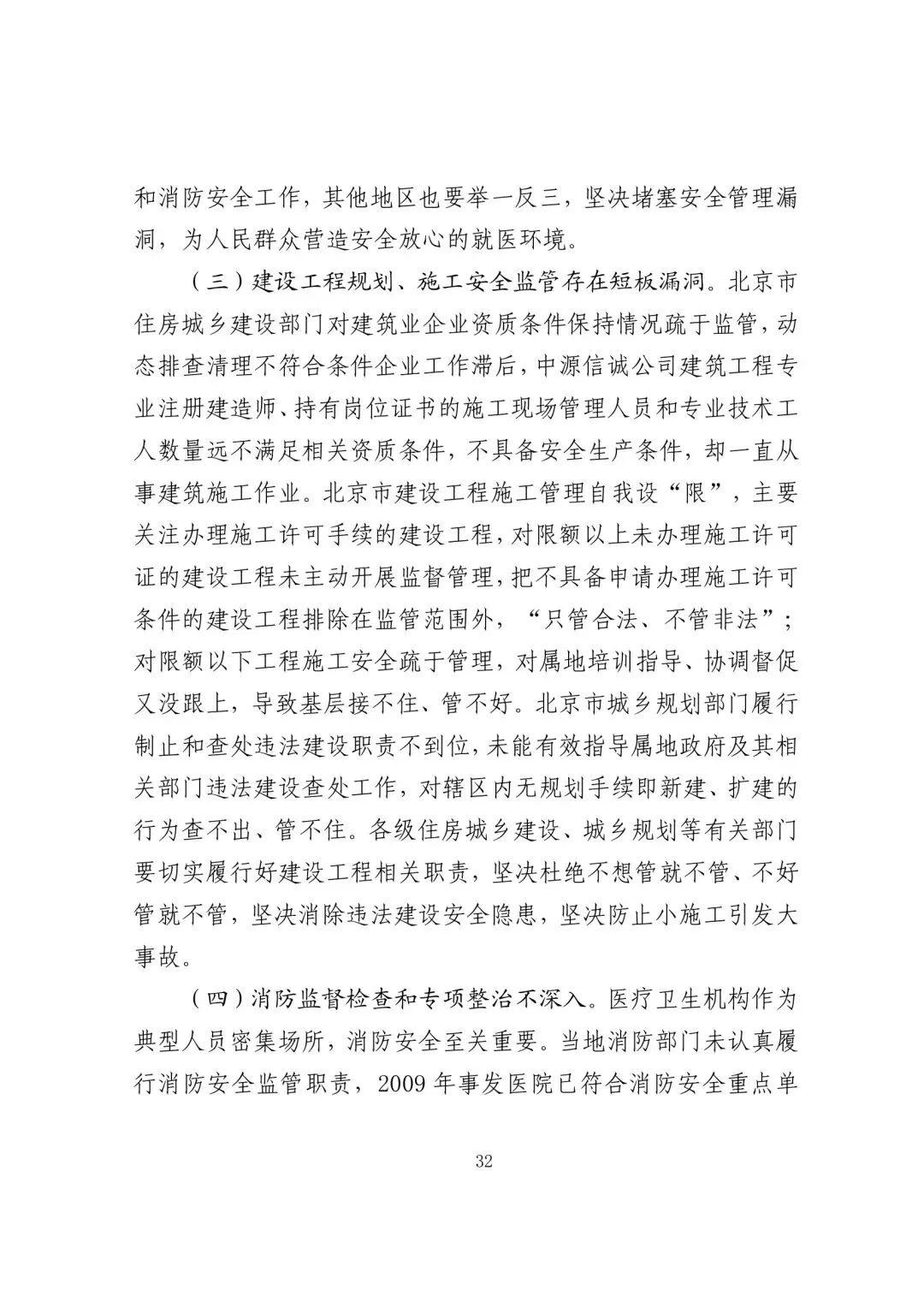 未认真履行行业安全监管职责,对行业存在不具备取得施工许可的建设工程监管不力的问题失察失管,对丰台区住房城乡建设委长期存在无施工许可手续工程监管职责不落实的问题失察。落实建设工程施工现场消防安全专项检查要求不力。未按照有关要求对建筑业企业资质进行动态监管,对施工单位中源信诚公司未保持建筑业二级资质许可条件的问题失察失管。