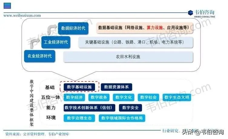 从数字中国建设的整体框架来看,算力基础设施是数字基础设施(还包括网络基础设施、应用基础设施)的重要组成部分,是数字经济时代的新型生产力。