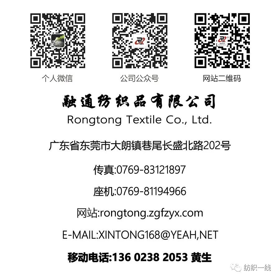 东莞市融通纺织品有限公司位于中国最大的纺织基地--广东省东莞市大朗镇..融通纺织是一家以研发,销售经营.中高端各类型纺织品的综合型私营企业,通过多年努力.有十多年染色经验.现集纺纱.织造.染整于一体.设备配套齐全.技术力量.产品远销国内外各地等等.....多品种经营及良好的售后服务。