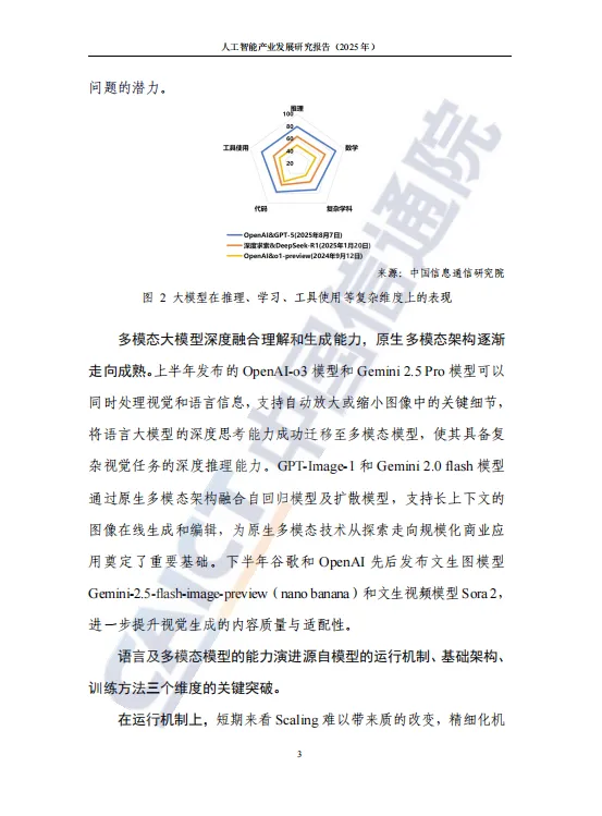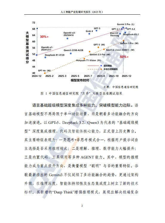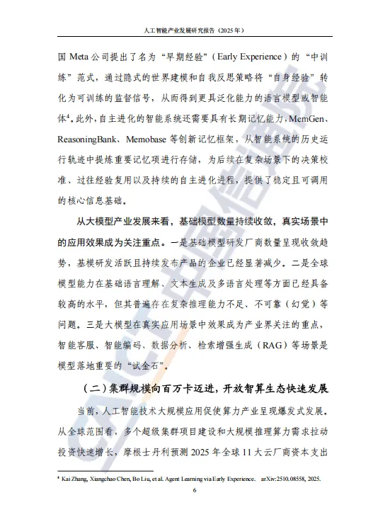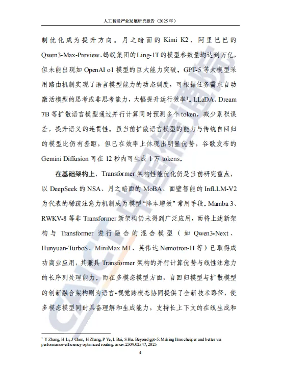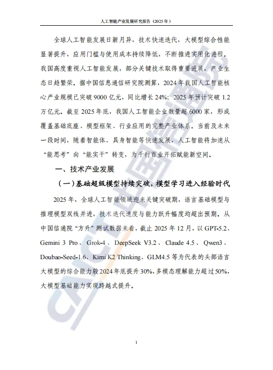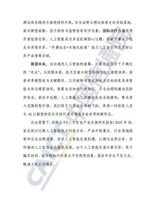 近日,中国信息通信研究院发布了《人工智能产业发展研究报告(2025年)》。报告全面探讨了基础模型演进、具身智能突破、智算基础设施升级、智能原生应用涌现、安全治理实践及全球合作进展等,并对迈向通用人工智能(AGI)的路径进行了前瞻展望,以期与业界分享,共同推动人工智能生态蓬勃发展。