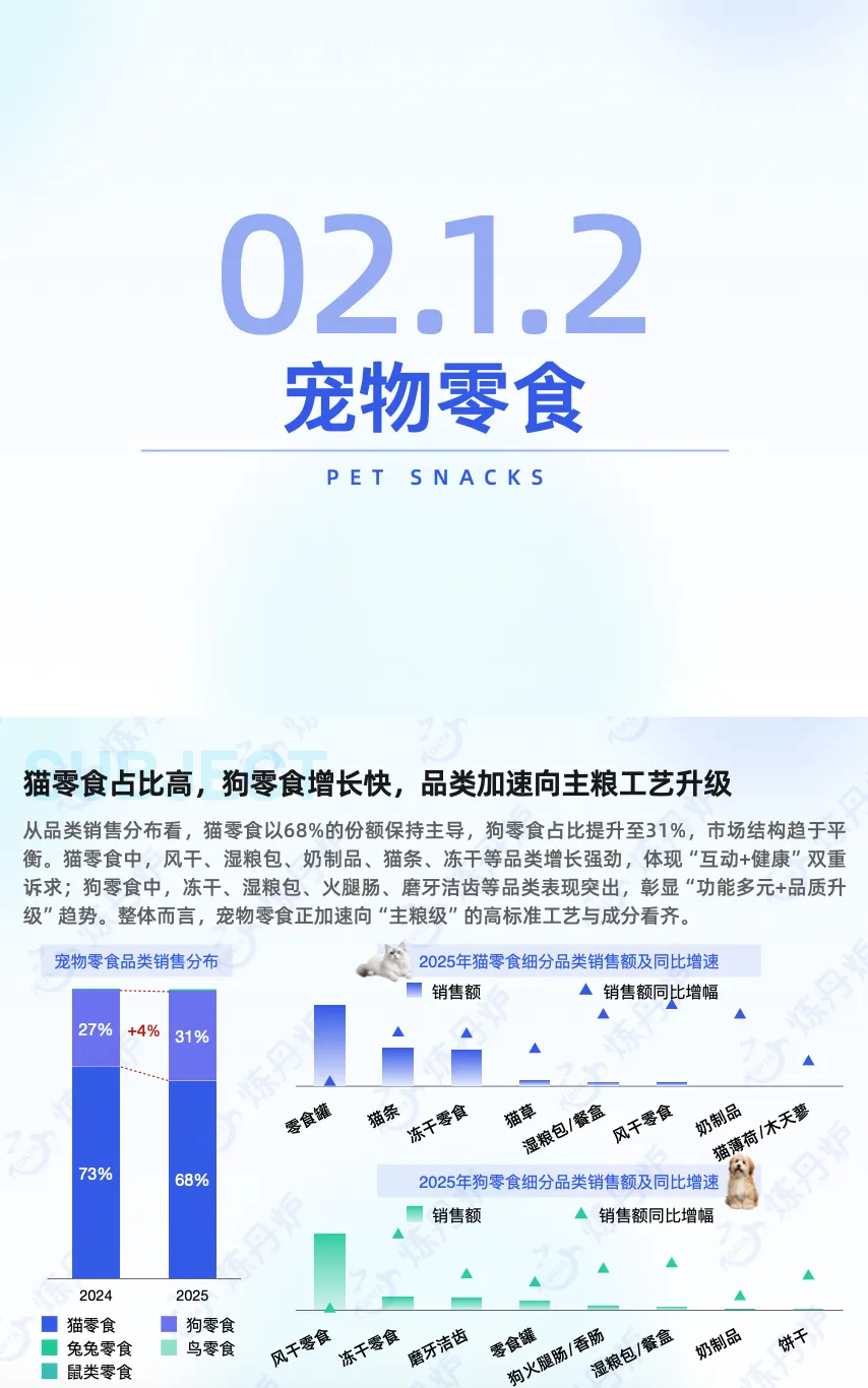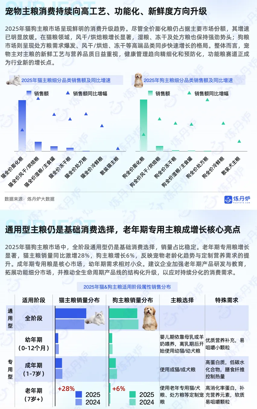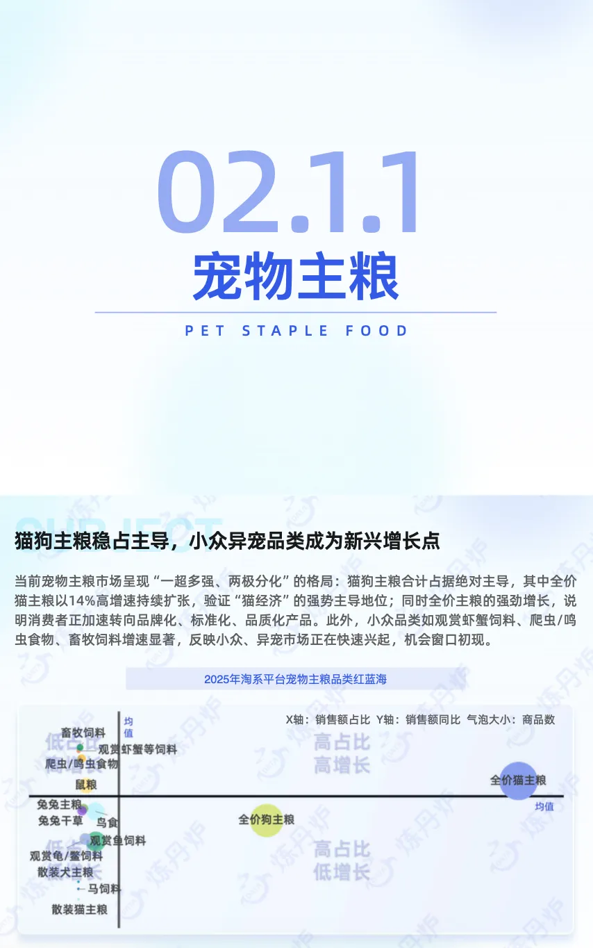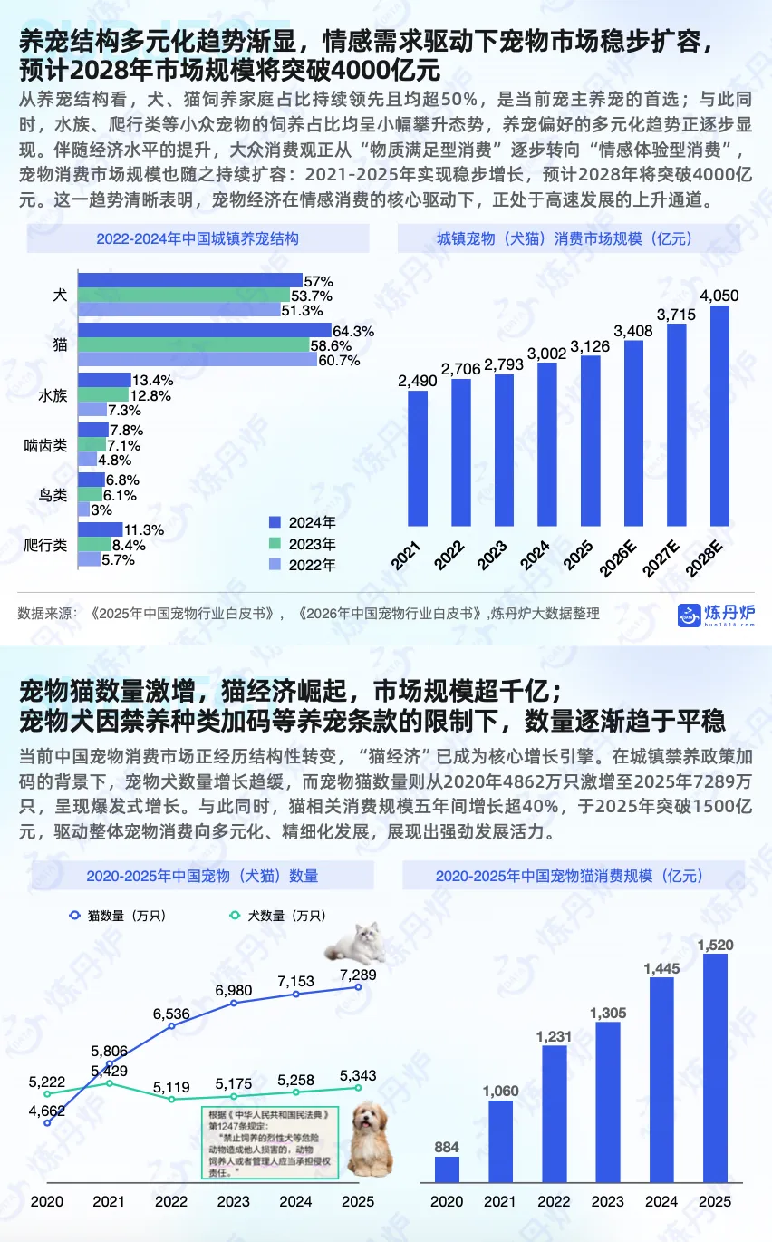 从养宠结构看,犬、猫饲养家庭占比持续领先且均超50%,是当前宠主养宠的首选;与此同时,水族、爬行类等小众宠物的饲养占比均呈小幅攀升态势,养宠偏好的多元化趋势正逐步显现。伴随经济水平的提升,大众消费观正从 “物质满足型消费” 逐步转向 “情感体验型消费” ,#宠物消费 市场规模也随之持续扩容:2021-2025年实现稳步增长,预计2028年将突破4000亿元。这一趋势清晰表明,#宠物经济 在情感消费的核心驱动下,正处于高速发展的上升通道。