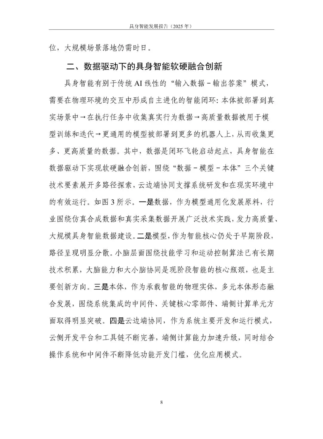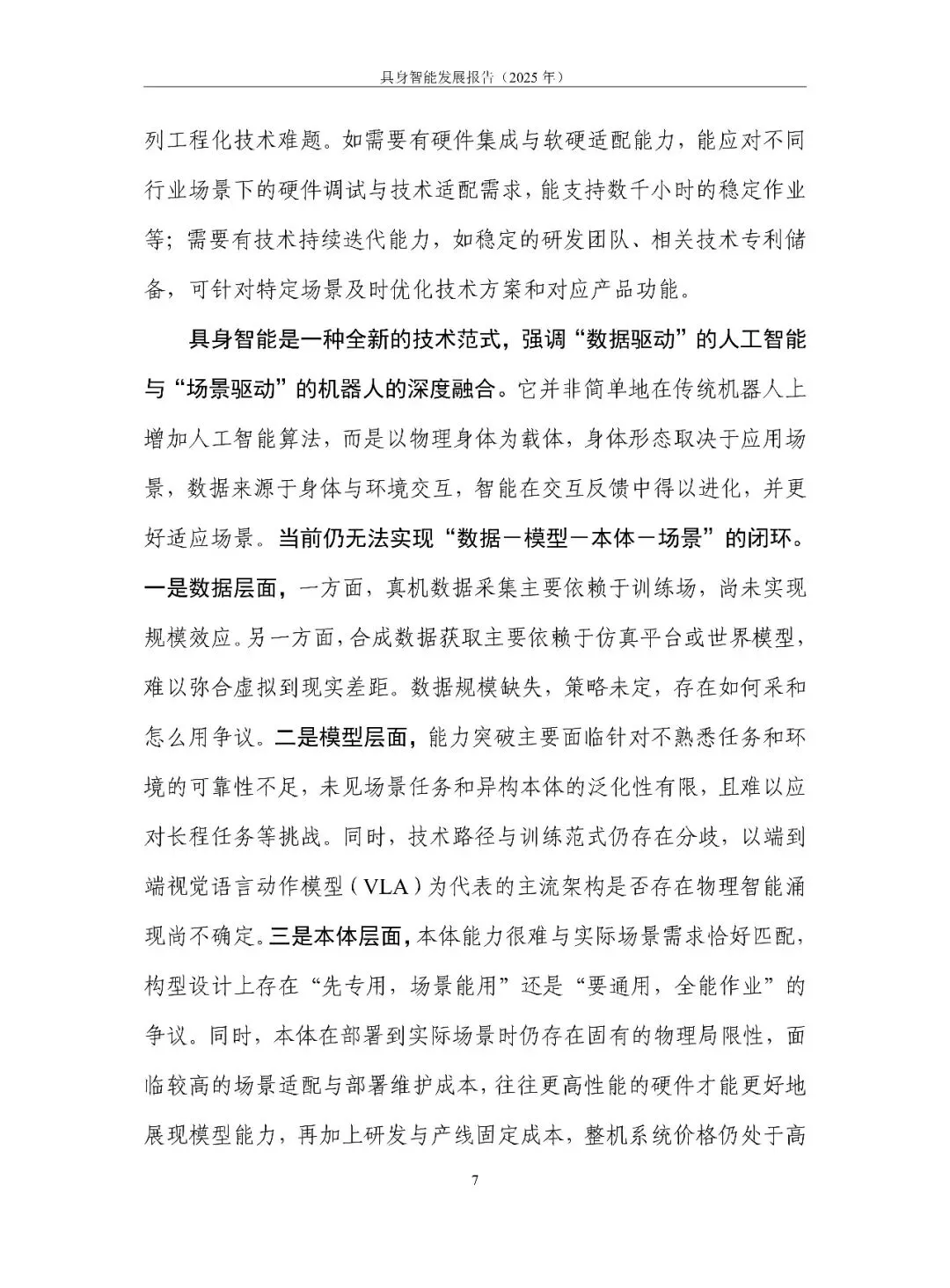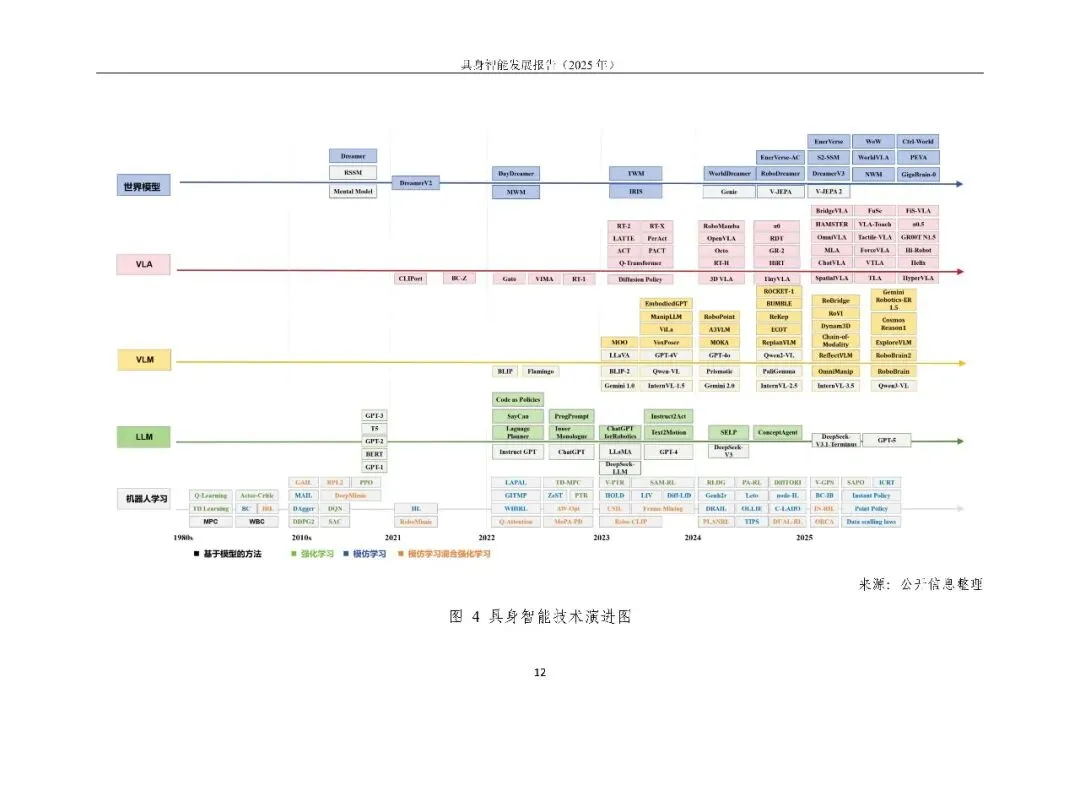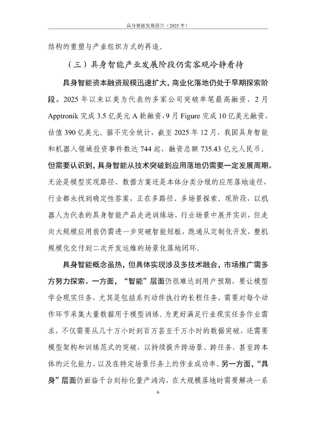 具身智能正从“能动”走向“好用”。报告用一句话定调:它是 AI 走进物理世界、形成“感知-认知-决策-执行”数据闭环的新范式,核心在“数据-模型-本体”飞轮。2025 年全球融资超 700 亿元,但仍在“演示”期:VLA 大模型爆发却泛化不足,本体呈人形、四足、轮臂多元,却受限于成本高、寿命短、安全缺标。训练场全国已建 30 余座,真机数据仍缺百万小时。