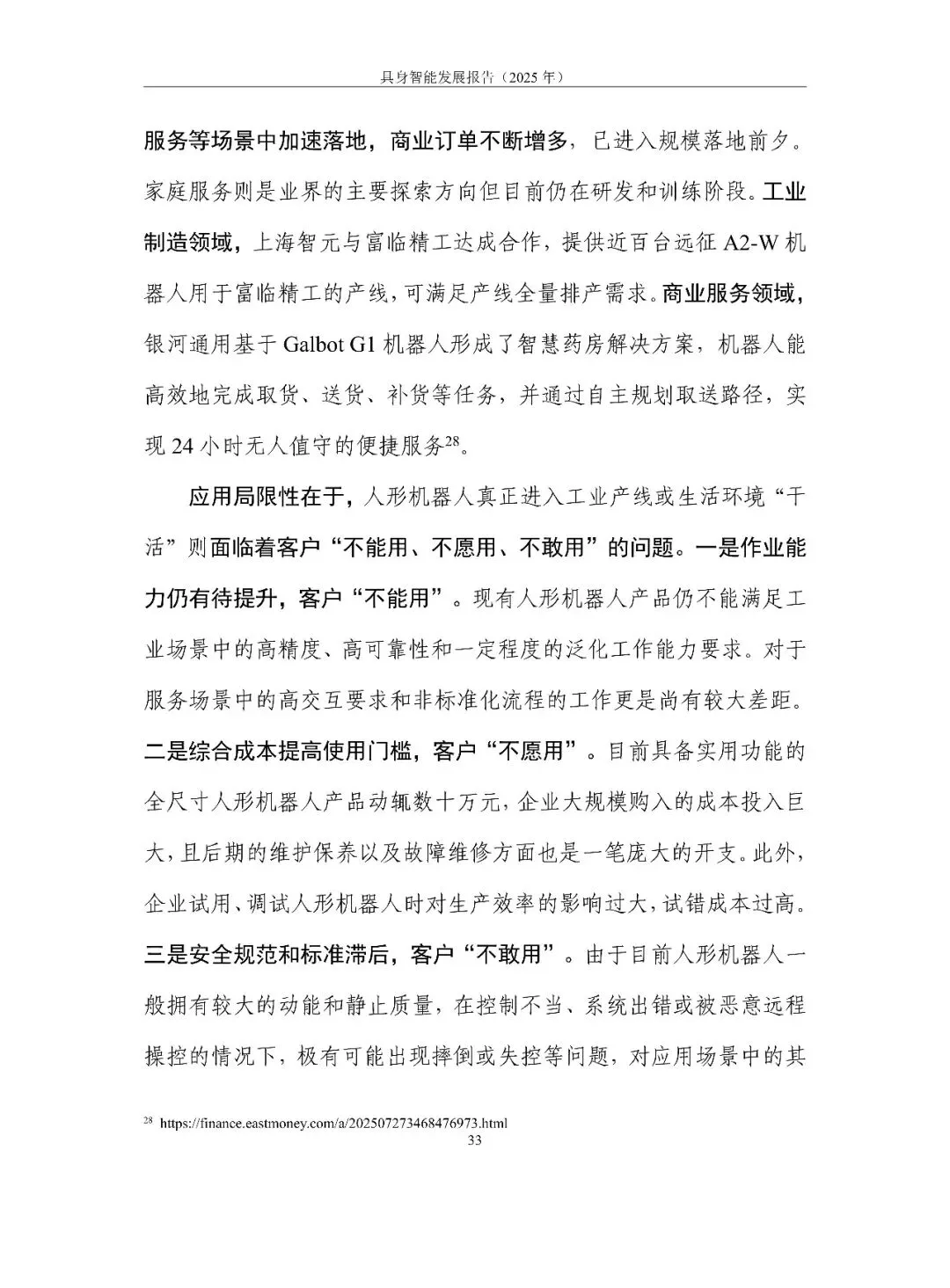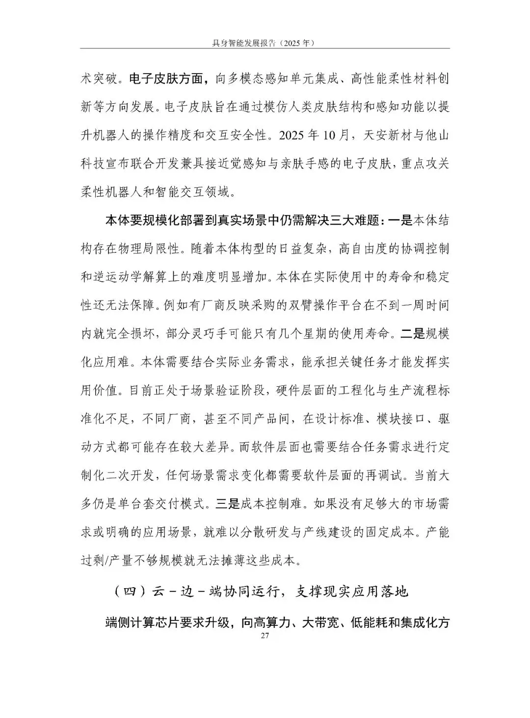 场景落地呈“三快三慢”:自动驾驶、无人机、机器狗已小跑进入商用;双足人形、工业复合臂、家庭服务仍“不能用、不敢用、不愿用”。未来两年关键在统一数据接口、建立安全伦理框架、把轮式人形和 L4 无人车做成首批规模化品类,让具身智能先成为生产工具,再成为生活伙伴。
