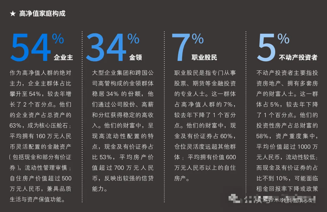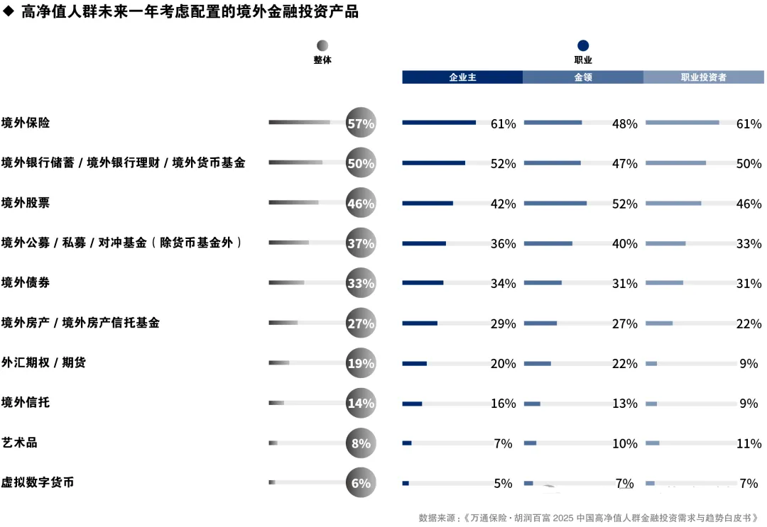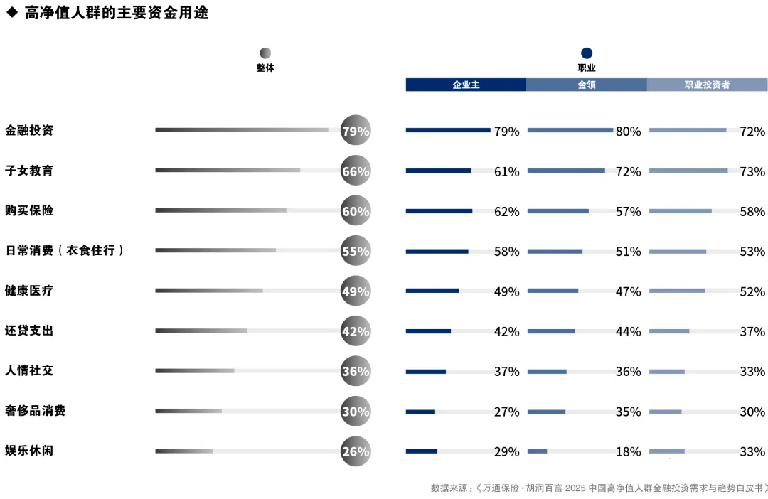 作者简介:梁晶晶,中南财经政法大学学士,深耕保险行业 20 年,凭借专业积淀为个人及家庭客户提供全生命周期的定制化保险解决方案。从业至今,已连续多年斩获全行业最高级别国际龙奖,其专业能力与服务口碑深受市场认可。依托 20 年保险行业经验,精准洞察个人及家庭在不同人生阶段的风险缺口,为客户量身搭建医疗、意外、重疾、寿险、养老等多维度保障体系。若您有个人保障方案定制、家庭保单诊断、现有保险优化等需求,可直接添加微信:ginawings,获取 1 对 1 专属咨询服务。万通保险扎根香港50周年里程碑时刻,携手最懂中国富豪、记录中国财富变迁的胡润百富,联合发布了《2025中国高净值人群金融投资需求与趋势白皮书》。不仅是一份对中国206.6万户高净值家庭的深度解码,更是万通保险在扎根香港50周年的历史性节点上,对市场的深刻洞察和对未来价值趋势的前瞻,为未来财富管理模式落下的一次关键“定义”。万通保险国际有限公司执行董事兼行政总裁张希凡先生亲自为报告撰写序言,宣布万通保险将全面升级服务体系,致力于为客户提供多元化、全球化、个性化及长周期陪伴的财富管理方案,指明万通保险未来的战略发展方向。胡润集团董事长/首席调研官胡润先生开篇名义,指出了高净值人群财富管理策略的3大关键转向:投资逻辑从“增长优先”转向“防御与弹性双驱动”、境外投资已从“可选项”变为“必选项”、保险的功能定位正经历一场深刻的“价值升维”,清晰呈现出高净值人群财富思维的变迁。600万人民币净资产:富裕家庭,同比降0.3%,减少了1.4万户至512.8万户;1000万人民币净资产:高净值家庭,同比降0.8%,减少了1.7万户至206.6万户;1亿元人民币净资产:超高净值家庭,同比降1.7%,减少了2,200户至13.1万户;3000万美元净资产:国际超高净值家庭,同比降2.3%,减少了2,000户至8.6万户。2、高净值家庭地域分布:省级层面,广东领跑千万人民币净资产高净值家庭数量;城市维度,北京、上海、香港稳居前三甲3、高净值家庭构成:企业主占比54%成为绝对主力,金领占比34%次之,职业股民占比7%,不动产投资者占比5%4、高净值人群的资金来源:主要来源于经营收入、工资收入和投资收益,主要用于金融投资、子女教育和购买保险高净值人群的收入结构差异,主要受财富创造模式和职业属性的影响。按财富创造模式,主要来源于经营收入(37%)、工资收入(28%)和投资收益(22%);从职业类型看,企业主最依赖经营收入(56%),金领最依赖工资收入(55%),职业投资者更依赖投资收益(61%)。高净值人群的资金投向清晰展示了三大核心关切:金融投资(79%)、子女教育(66%)与购买保险(60%),反映出高净值人士对资产保值增值与财富传承的持续追求,对子女教育的深切期望,也普遍重视风险保障,构建抵御不确定性的坚实防线。5、高净值人群未来一年资金调整:增加子女教育、金融投资、健康医疗和购买保险,削减奢侈品消费、人情社交、娱乐休闲和还贷支出1、高净值人群的投资目标:最关注的是资产保值与增长、为重大目标储备资金、获取稳定现金流