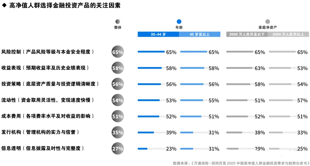 从家庭净资产规模来看,净资产3000万人民币及以下者,相比3000万人民币以上者,更关注收益表现;而净资产3000万人民币以上者,更关注流动性;