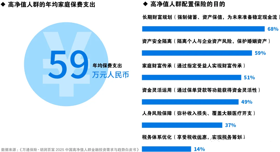 2、中国高净值人群年均保费投入59万元人民币,长期财富规划(68%)、资产安全隔离(59%)与家庭财富传承(51%)是高净值人群配置保险的主要目的