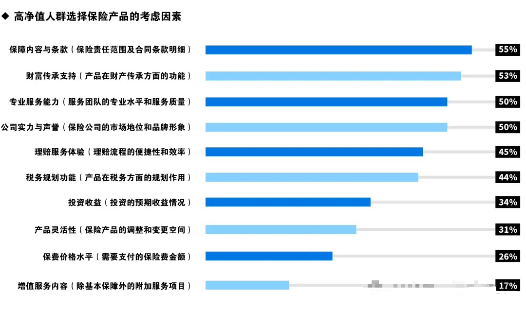 3、高净值人群选择保险产品的考虑因素,首要考量保障内容与条款,其次是财富传承支持
