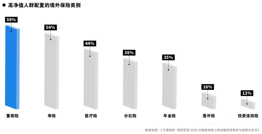 4、高净值人群境外保险的需求偏好:重疾险(59%)、寿险(54%)和医疗险(44%)占据主导地位
