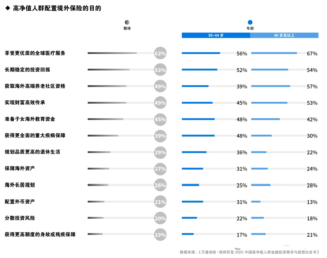 高净值人群在今外保险配置上呈现显著的年龄分化特征:45岁以上群体超过半数(57%)优先选择获取海外高端养老社区资格,比例远高于30-44岁人群(39%),后者更注重获得更全面的重大疾病保障。