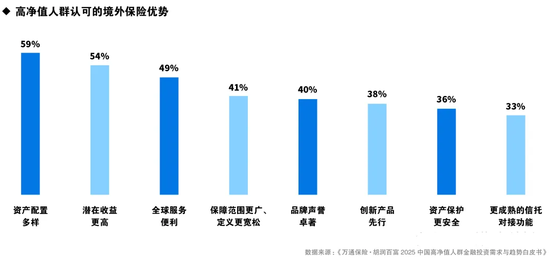 7、高净值人群对境外保险的青睐,主要基于三大优势:资产配置多样性(59%)、潜在收益更高(54%)与全球服务便利(49%)