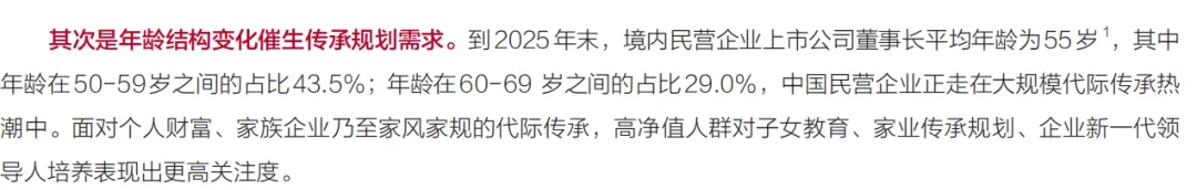 这说明,传承意识正在从高龄阶段明显前移,成为越来越多年轻高净值人士的理性选择。