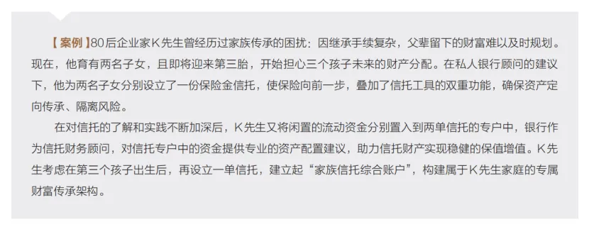 其次,将部分闲置流动资金注入信托专户,由银行提供专业的资产配置服务,实现信托财产本身的保值增值,让传承资产“活起来”。