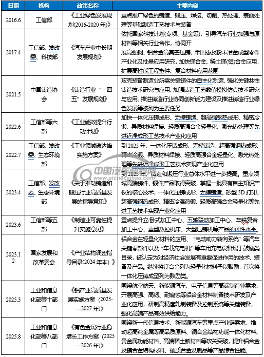 表 1 中国压铸件行业相关政策梳理