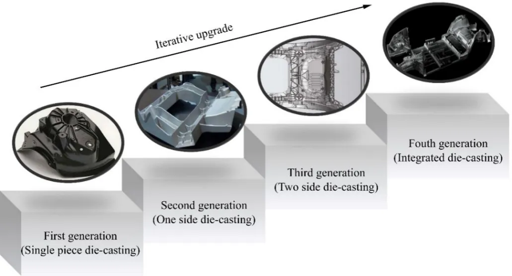 一体化压铸技术在汽车领域的落地应用共经历了四次迭代升级,如上图所示。第一代技术为单件压铸,代表产品为汽车的后纵梁、纵梁前段连接件、减震塔等典型零部件,目前已经实现工业化生产。第二代技术为后车身的单边集成,目前纵梁和轮罩的一体化压铸件等也逐步应用于汽车制造中。第三代技术为后车身、前发仓双边集成压铸,目前正处于量产品质提升阶段,如特斯拉Model Y前车身、后车身一体式压铸零部件,这标志着第三代双边集成产品的落地应用。第四代技术为车身后底板、中段车身等大集成一体化压铸,当前第四代大集成压铸技术正处于结构设计阶段,必将成为未来一体化压铸领域的研究热点。目前,一体压铸技术主要应用于前、后底板的一体成形制造,但其底板中部及车身其他结构件(侧围、顶盖、后盖板等)的研究及应用相对匮乏。因此,未来汽车行业的长期发展目标为实现下车身一体化压铸。