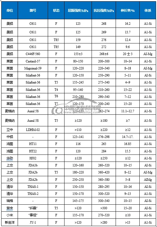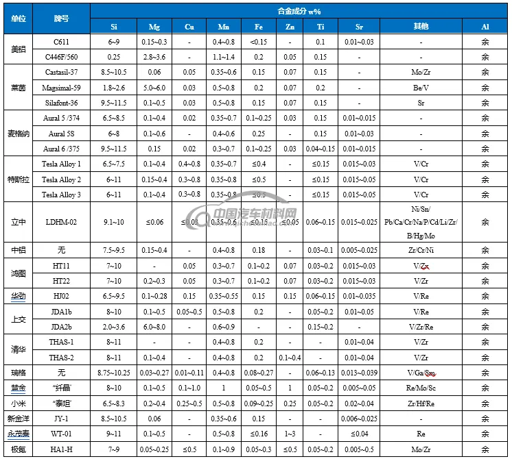 目前,国内已有多家单位拥有自主免热处理合金的知识产权,包括清华大学(与一汽铸造有限公司合作)、上海交通大学(与华人运通合作)、小米汽车、蔚来汽车、广东鸿图、山西瑞格、立中集团、中国铝业、南通鸿劲、苏州慧金等。同时,也有企业如帅翼驰,通过获得美国铝业公司C611等材料专利的授权,在国内销售C611铝锭。