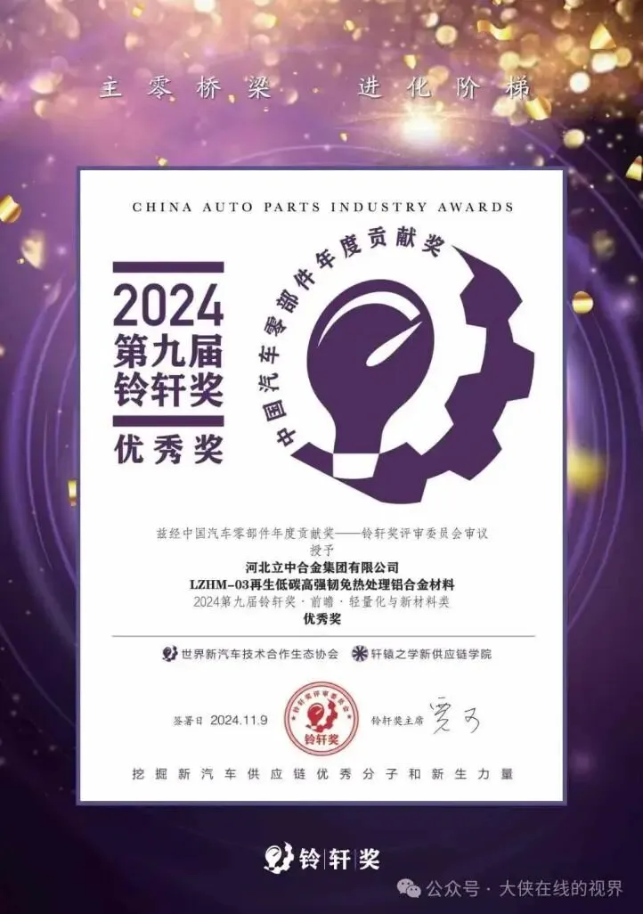 2024年11月,河北立中合金集团有限公司“LZHM-03再生低碳高强韧免热处理铝合金材料”成果荣获2024第九届铃轩奖•前瞻轻量化与新材料类优秀奖。在全球汽车产业转型升级以及持续降碳的需求下,立中集团历时4年针对LZHM-03再生低碳高强韧免热处理铝合金材料进行布局研发。该合金拥有宽容的成分设计、先进的工艺技术和优良的综合性能,可实现80%再生铝替代电解铝原料添加。与使用国内外传统免热处理材料相比,单吨碳排放量可降低80%,材料成本进一步降低。
