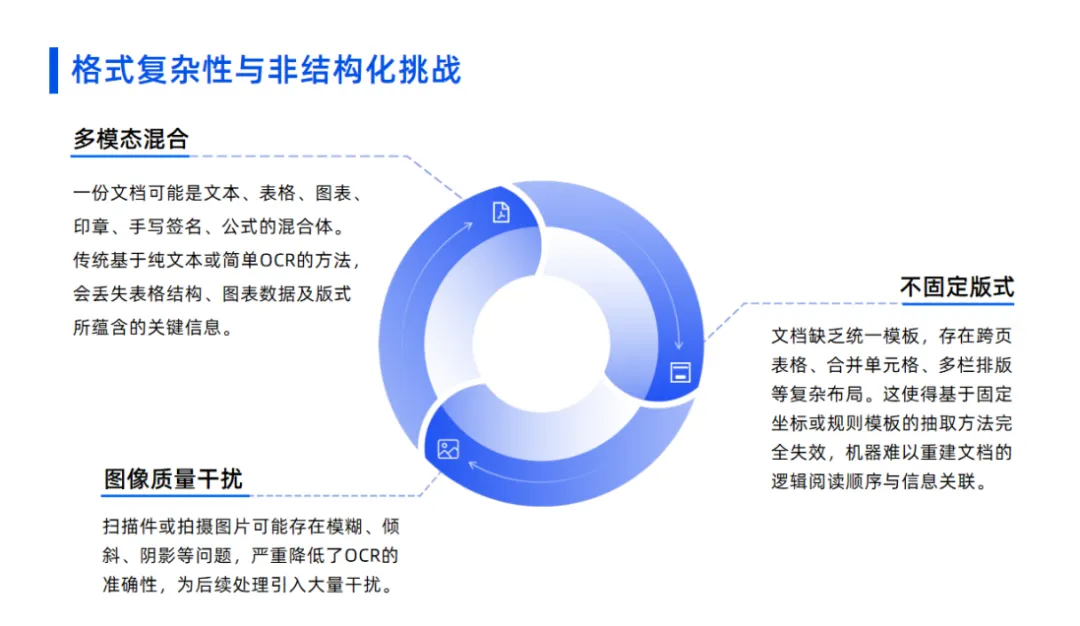 传统OCR只认字符,不认版面。但一份上市公司年报可能是:财务三表+趋势图表+董事长致辞+多栏附注+骑缝章的混合体。信息密度最高处,往往是表格与图表。