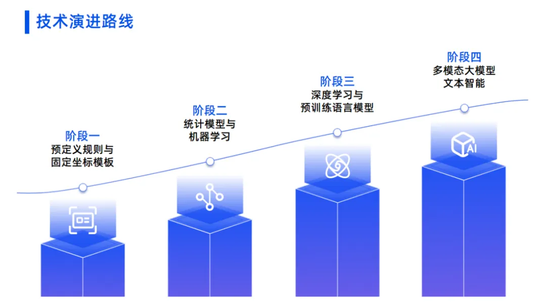 阶段一(2015年前):预定义规则与固定坐标模板,只能处理确定、重复的任务。阶段二(2015-2019):统计模型与机器学习,开始具备一定泛化能力。阶段三(2019-2024):深度学习与预训练语言模型,理解能力跃升但专业壁垒仍在。阶段四(2026年拐点):多模态大模型,实现"认知理解"与"决策生成"的统一。