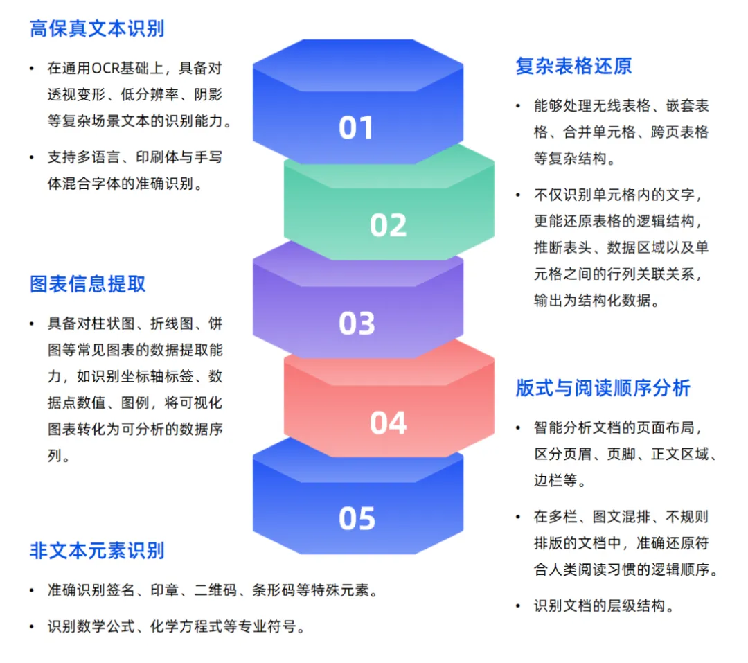 白皮书创造性地提出了复杂文本智能的五大核心能力标准,这构成了从沉睡文档到智能决策的完整技术栈。