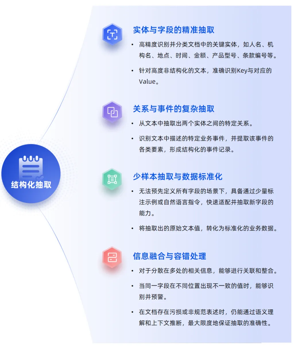 这是价值转化的核心执行层。白皮书将其定义为:"准确无误地定位、识别并提取业务关心的特定信息字段及其内在关联,转化为可供数据库调用的标准化数据。"