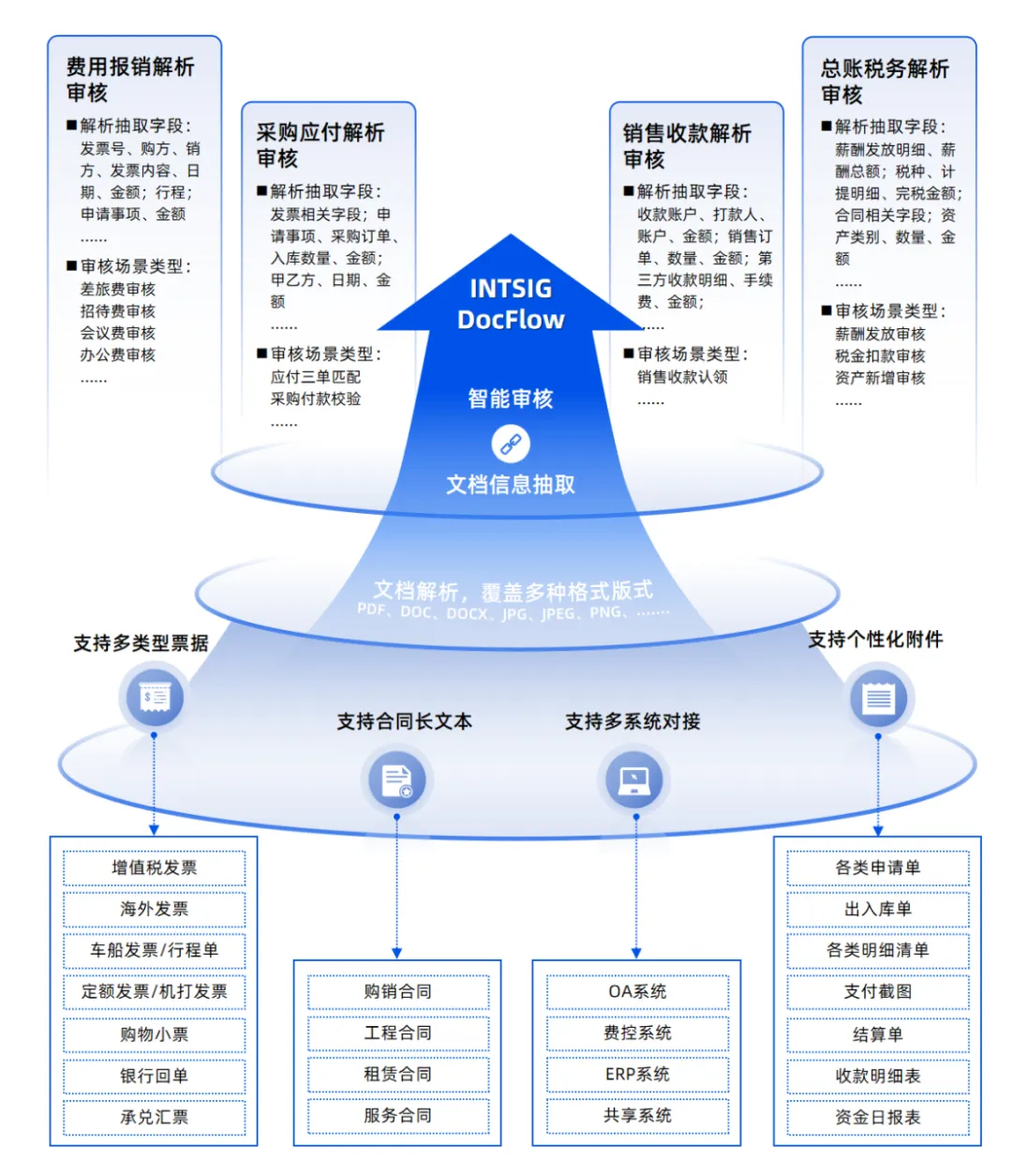 难点:发票、合同、银行回单、承兑汇票等版式各异,关键信息位置不固定。解法:INTSIG DocFlow支持40+类发票、15+类贸易合同的零样本抽取,准确率普遍超过90%。系统能自动匹配合同与发票的"三单合一",实现自动化三单匹配。