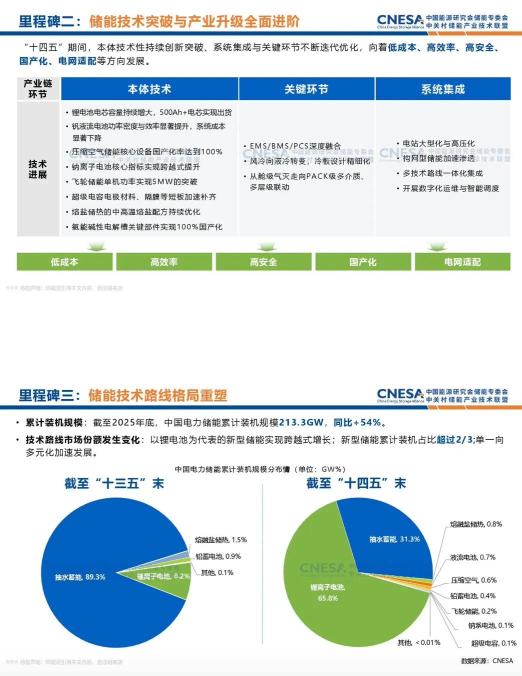 这份报告总结了 “十四五” 我国#新型储能 的跨越式发展,储能战略定位升级,累计装机突破 1 亿千瓦,锂电池占比超 65%,独立储能成主流应用。2025 年新增装机、海外订单规模大幅增长,中标价格下行,行业集中度提升。政策推动市场化与安全标准完善,预计 2030 年累计装机保守达 371.2GW,向长时化、高质量化迈进。