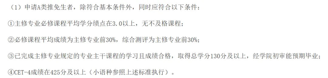 必修课程平均成绩为主修专业前30%,综合测评为主修专业前30%;